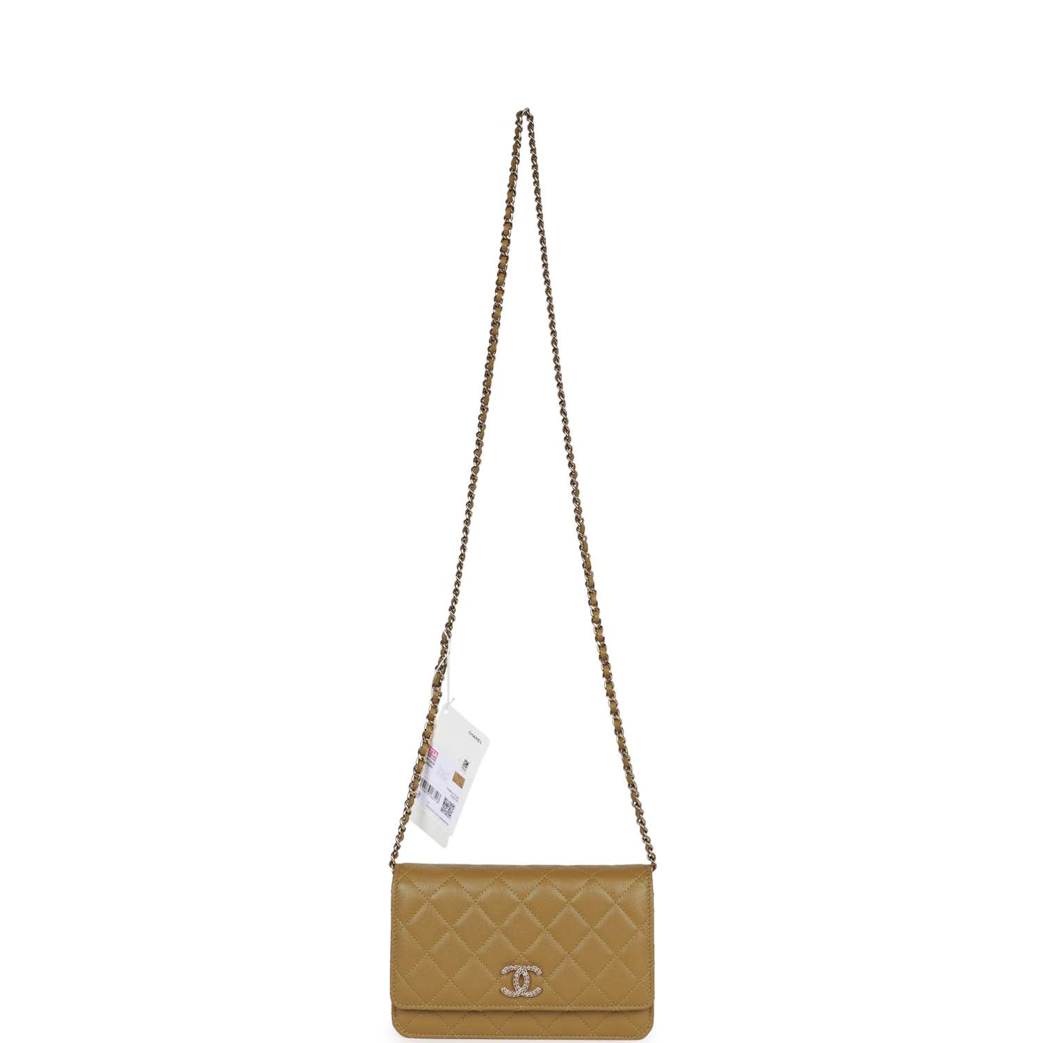 This Wallet On Chain is of Olive Green caviar leather with light gold tone hardware. has a front flap with faux crystal CC emblem. and a long light gold tone metal and olive green leather chain.
