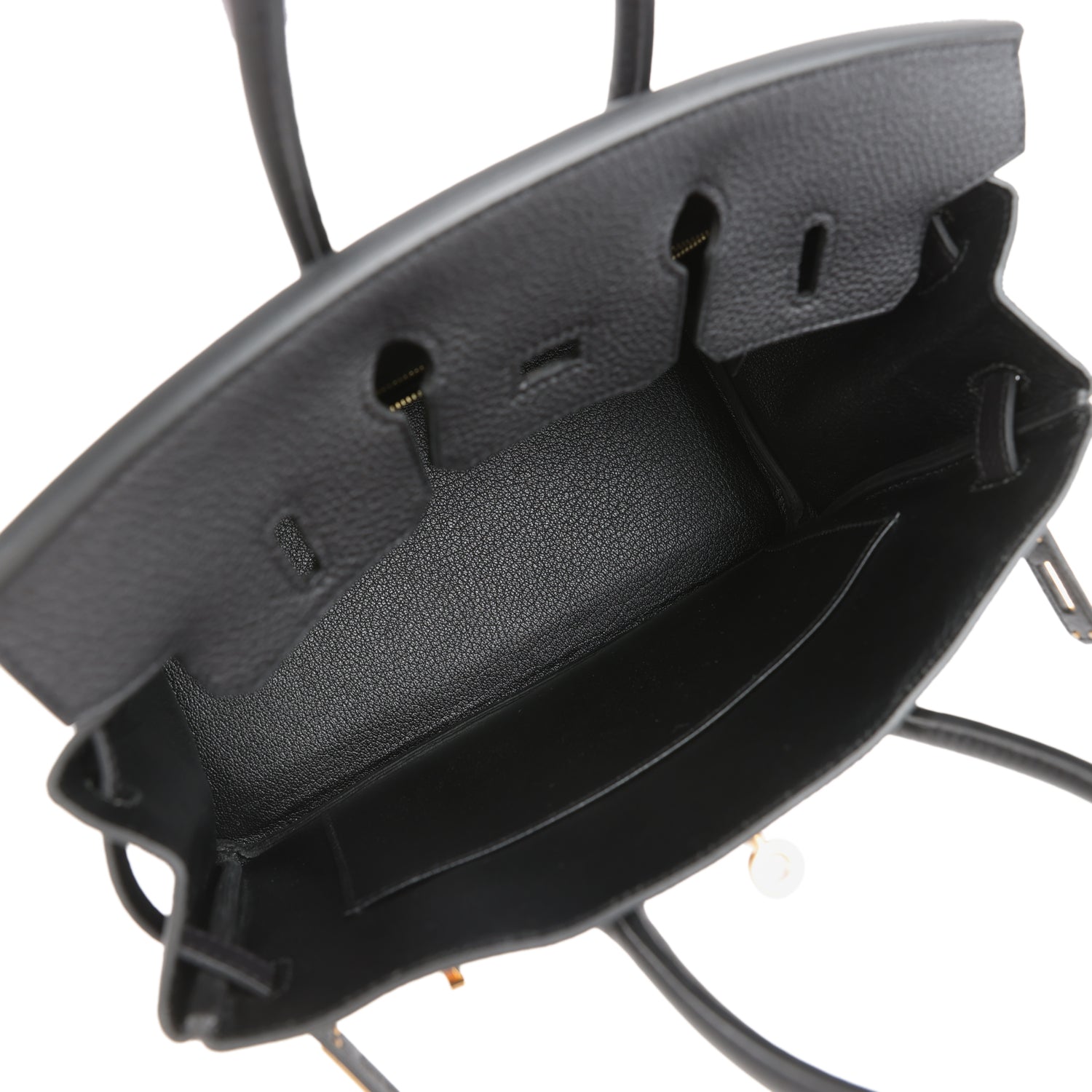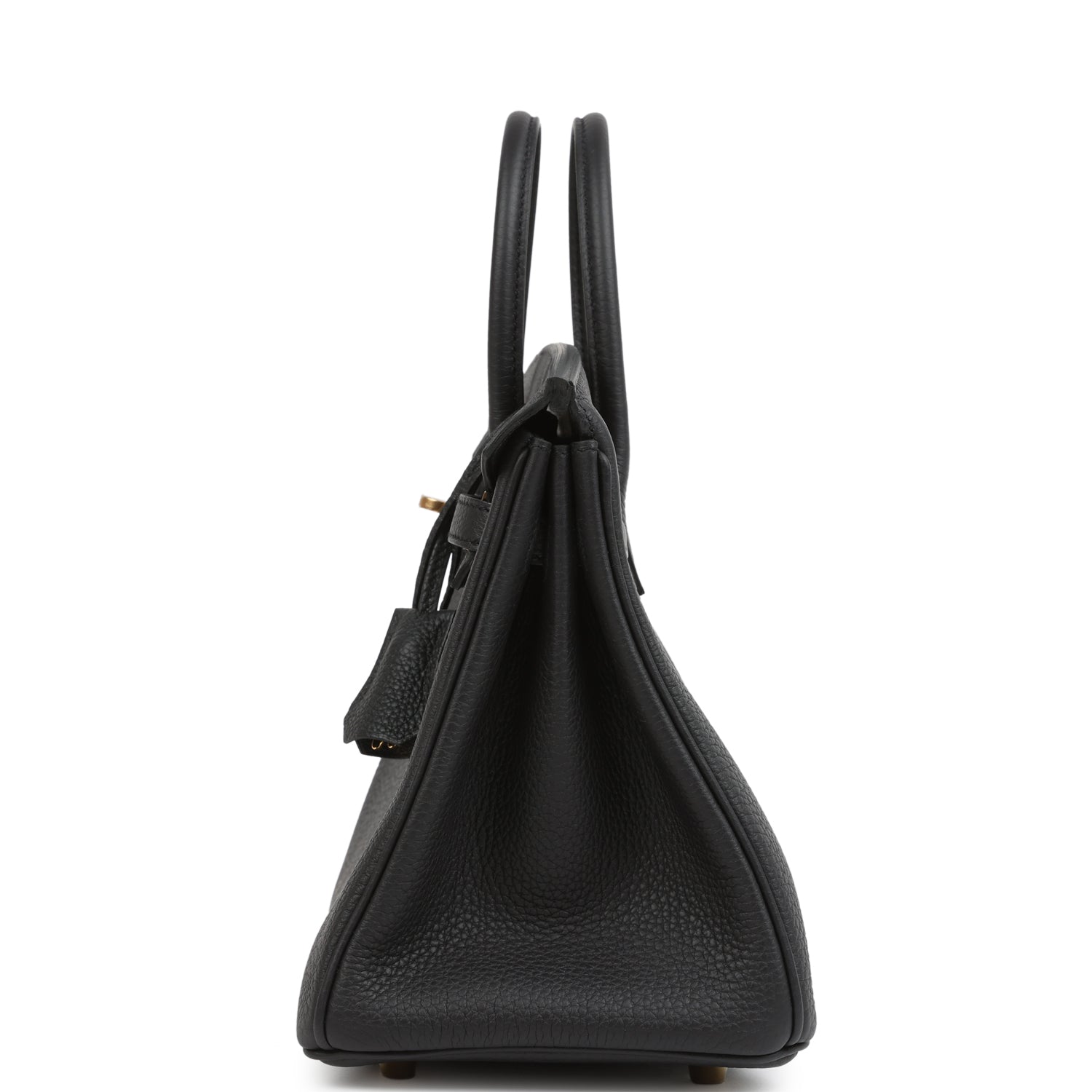 This Birkin is in Black togo leather with gold hardware. has tonal stitching. front flap. two straps with center toggle closure. clochette with lock and two keys. and double rolled handles.