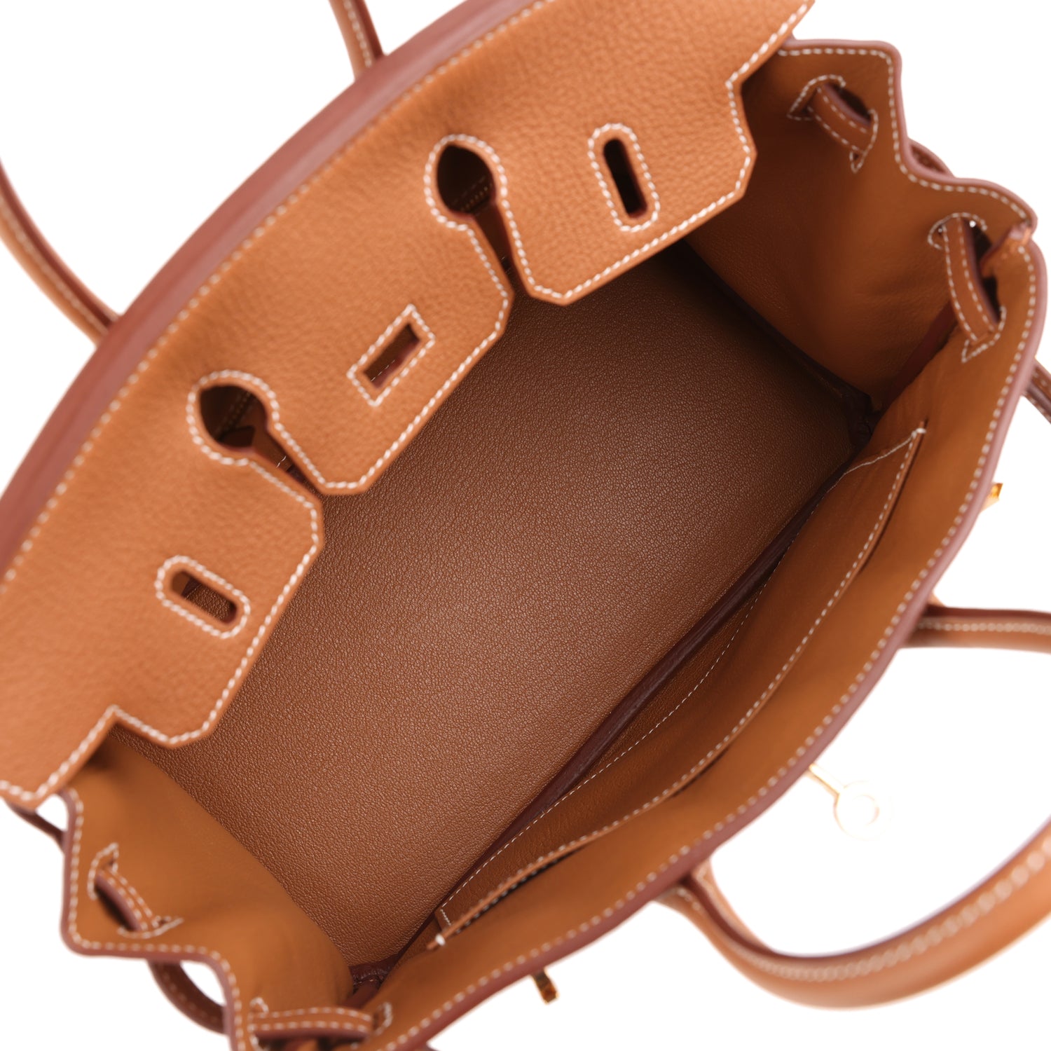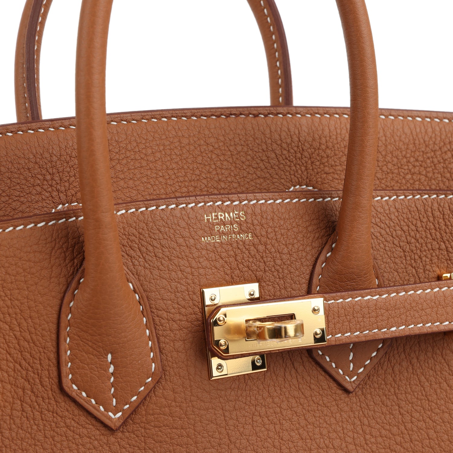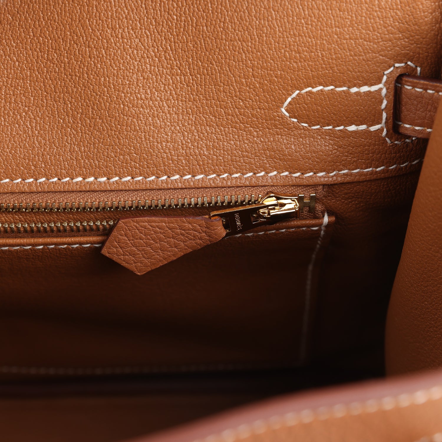 This Birkin is in Gold togo leather with gold hardware and features contrast stitching. front flap. two straps with center toggle closure. a clochette with lock and two keys and double rolled handles.