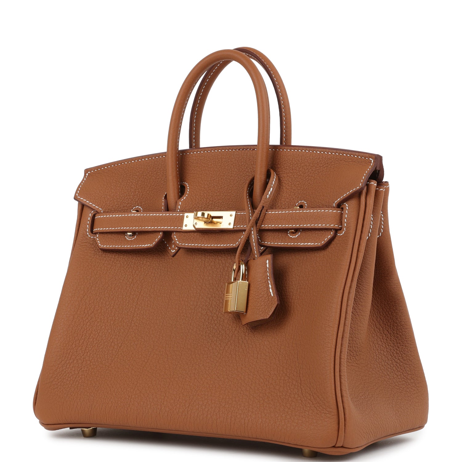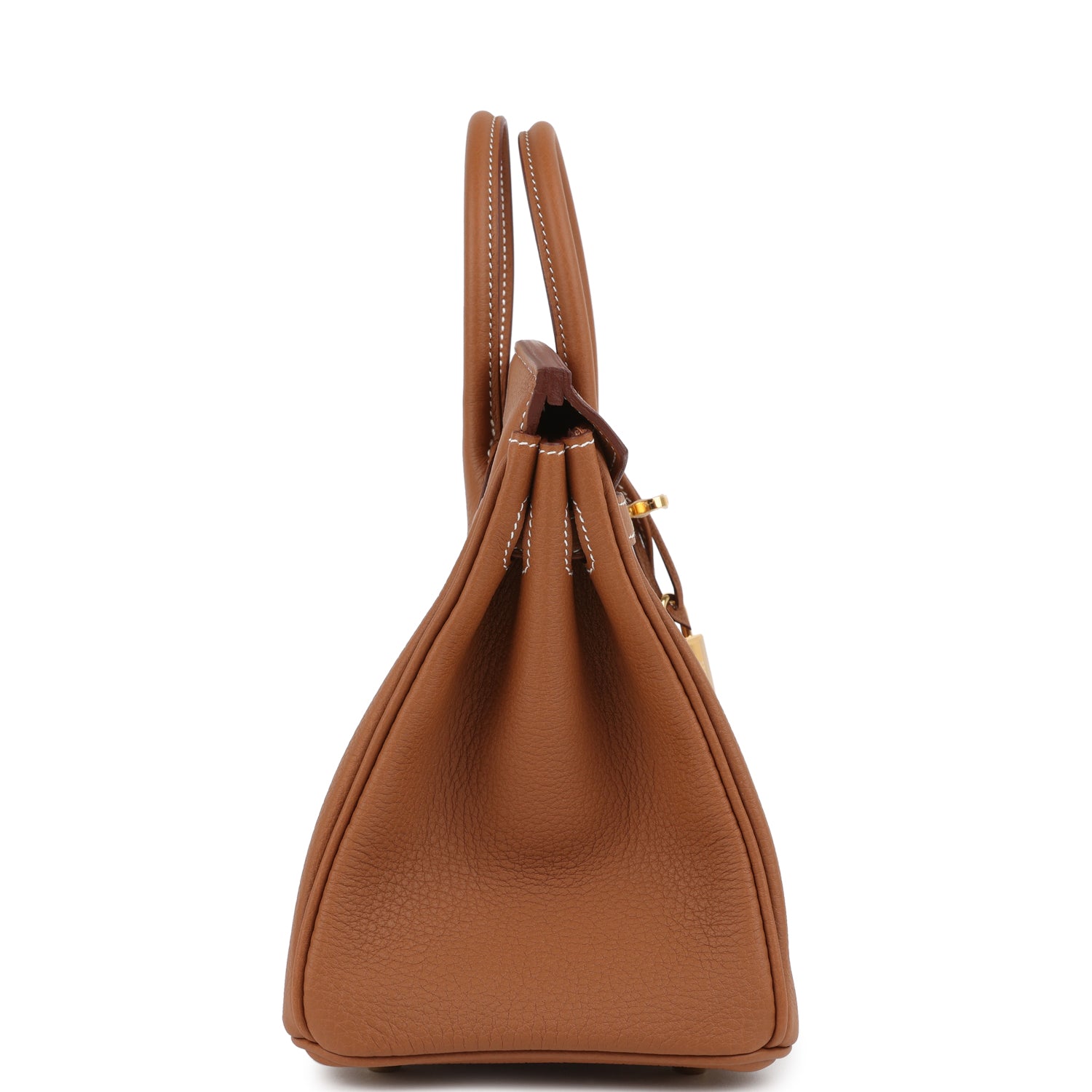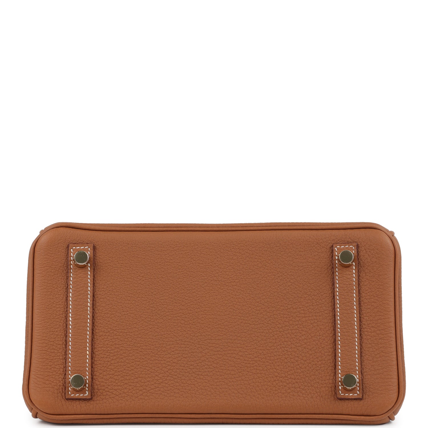 This Birkin is in Gold togo leather with gold hardware and features contrast stitching. front flap. two straps with center toggle closure. a clochette with lock and two keys and double rolled handles.