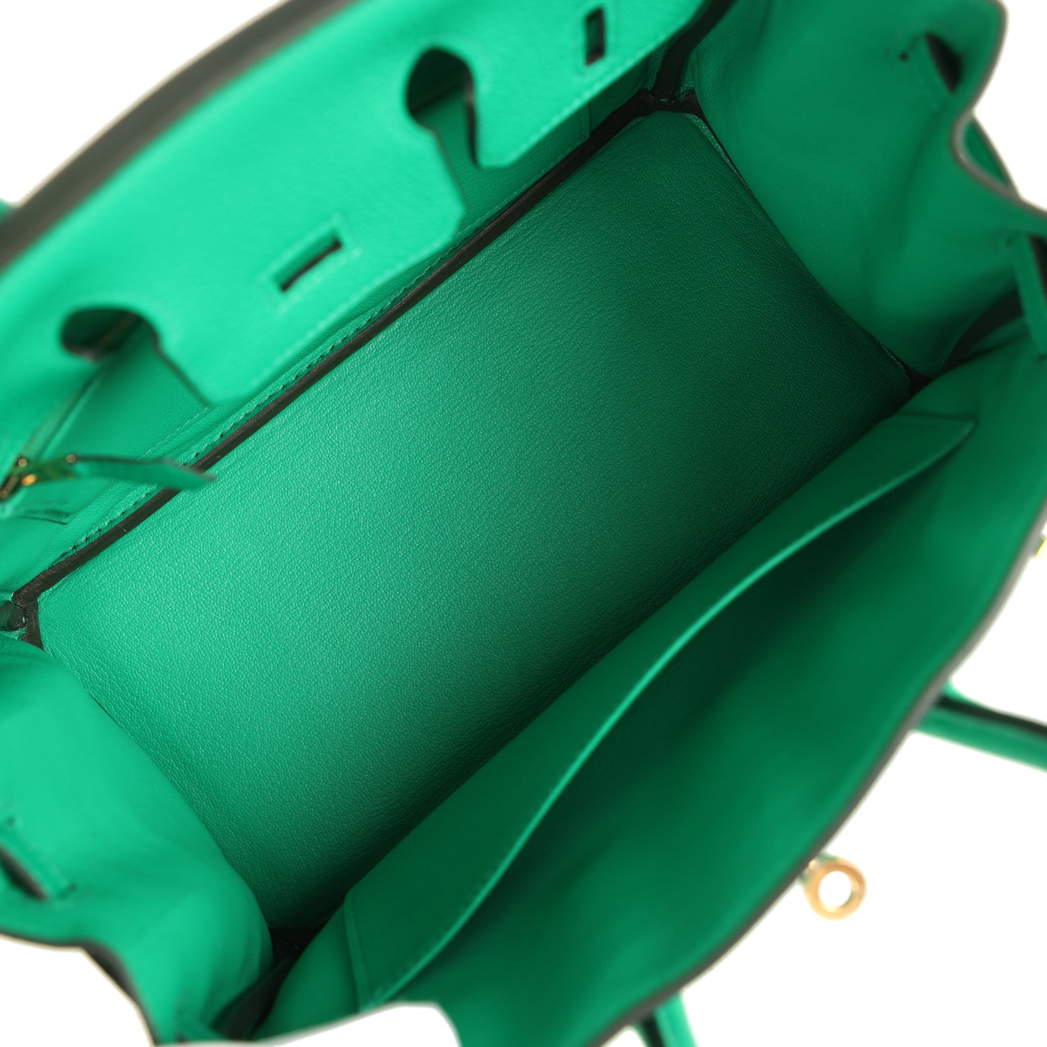 The interior is lined with Menthe chevre and has one zip pocket with an Hermes engraved zipper pull and an open pocket on the opposite side.