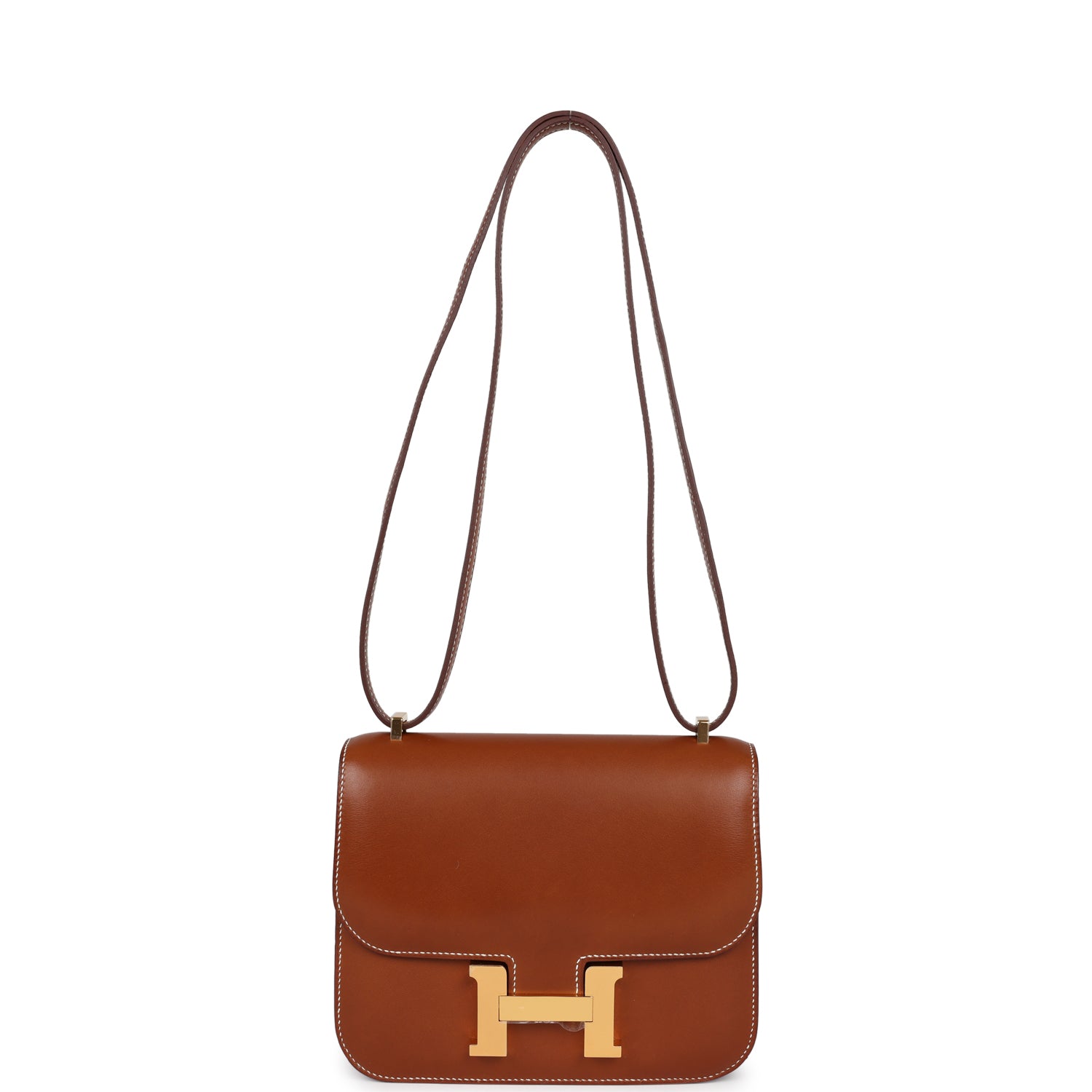 This Constance 1-18 is in Fauve Barenia leather with gold hardware and has contrast stitching. a metal "H" snap lock closure and adjustable shoulder strap.