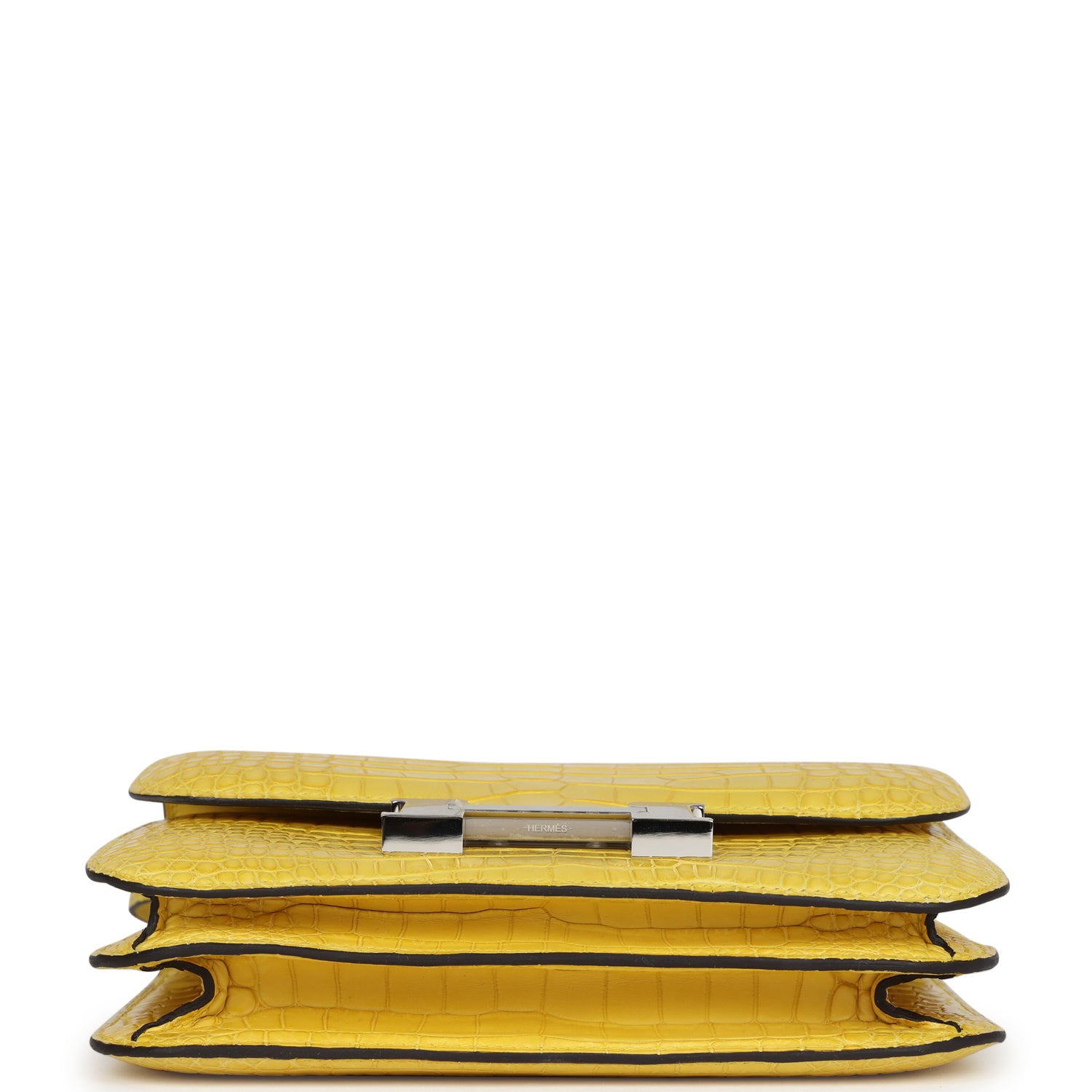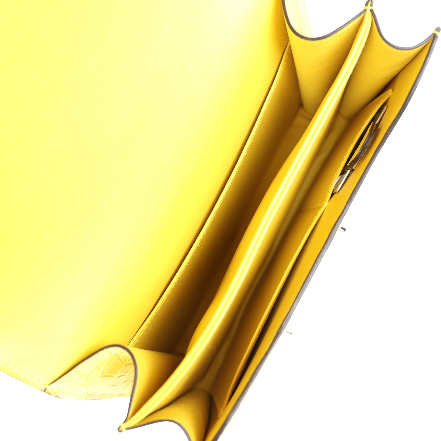 This Hermes Constance 1-18 is in Mimosa Matte Alligator Mississippiensis leather with Palladium Hardware. tonal stitching. metal "H" snap closure. and an adjustable strap.