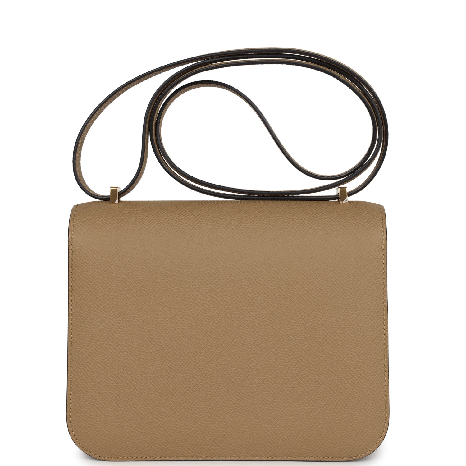 This Constance 1-18 is in Poussiere epsom leather with gold hardware and has tonal stitching. a metal "H" snap lock closure and adjustable shoulder strap.