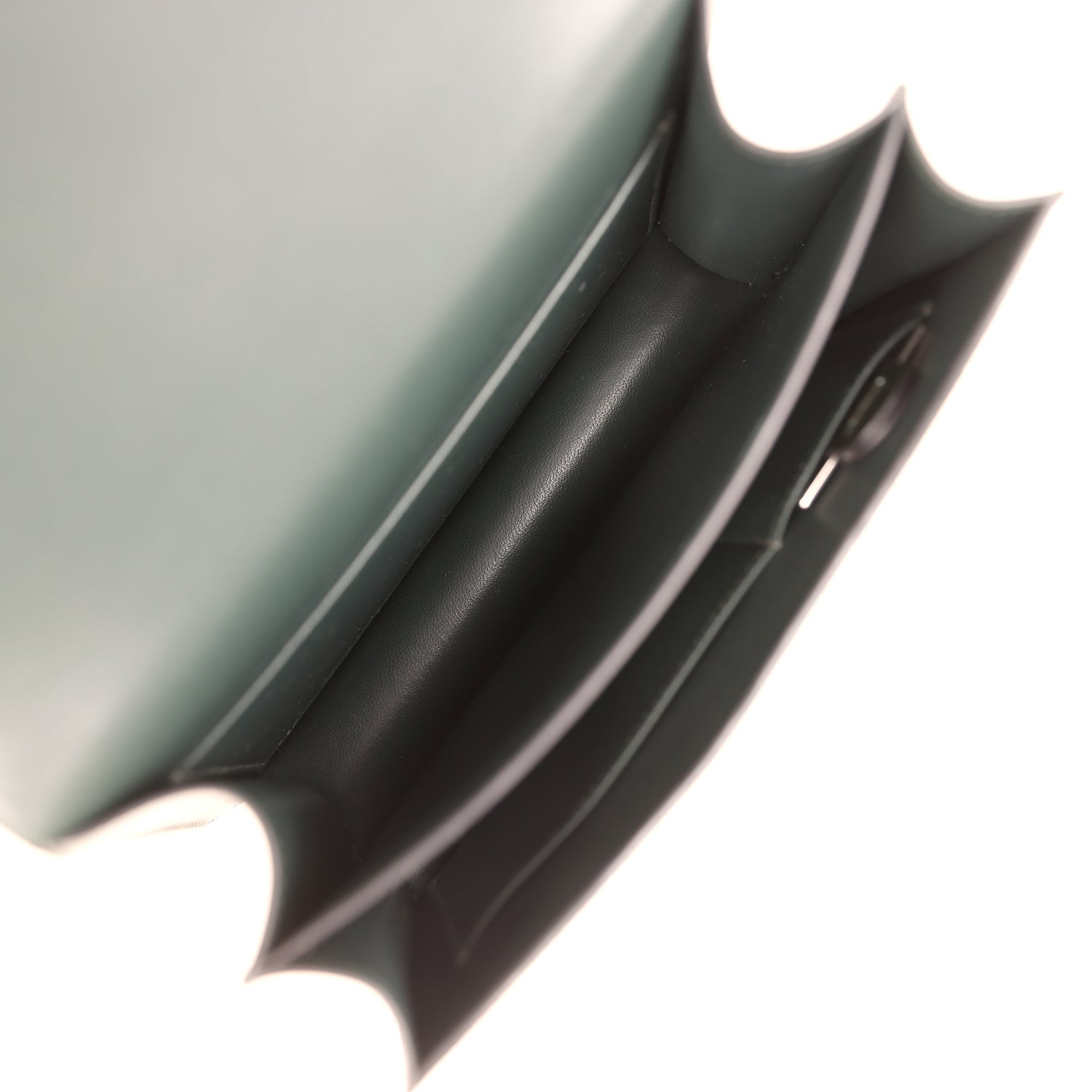 This Constance 1-18 is in Vert Fonce box calfskin leather with gold hardware and has tonal stitching. a metal "H" snap lock closure and adjustable shoulder strap.