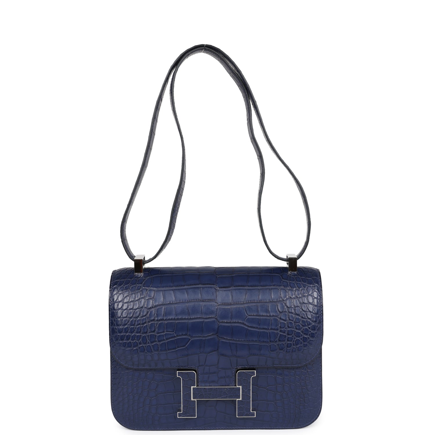 This Constance 1-24 is in Bleu Saphir Matte Alligator Mississippiensis leather with Marquette and palladium hardware and has tonal stitching. a metal "H" snap lock closure and adjustable shoulder strap.