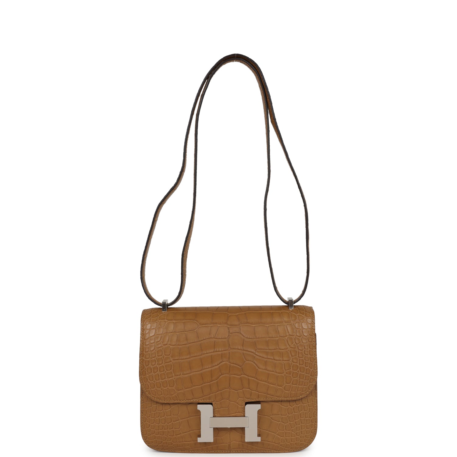 This Constance is in Kraft Matte Alligator Mississippiensis leather with palladium hardware. tonal stitching. metal "H" snap closure. and an adjustable shoulder strap.