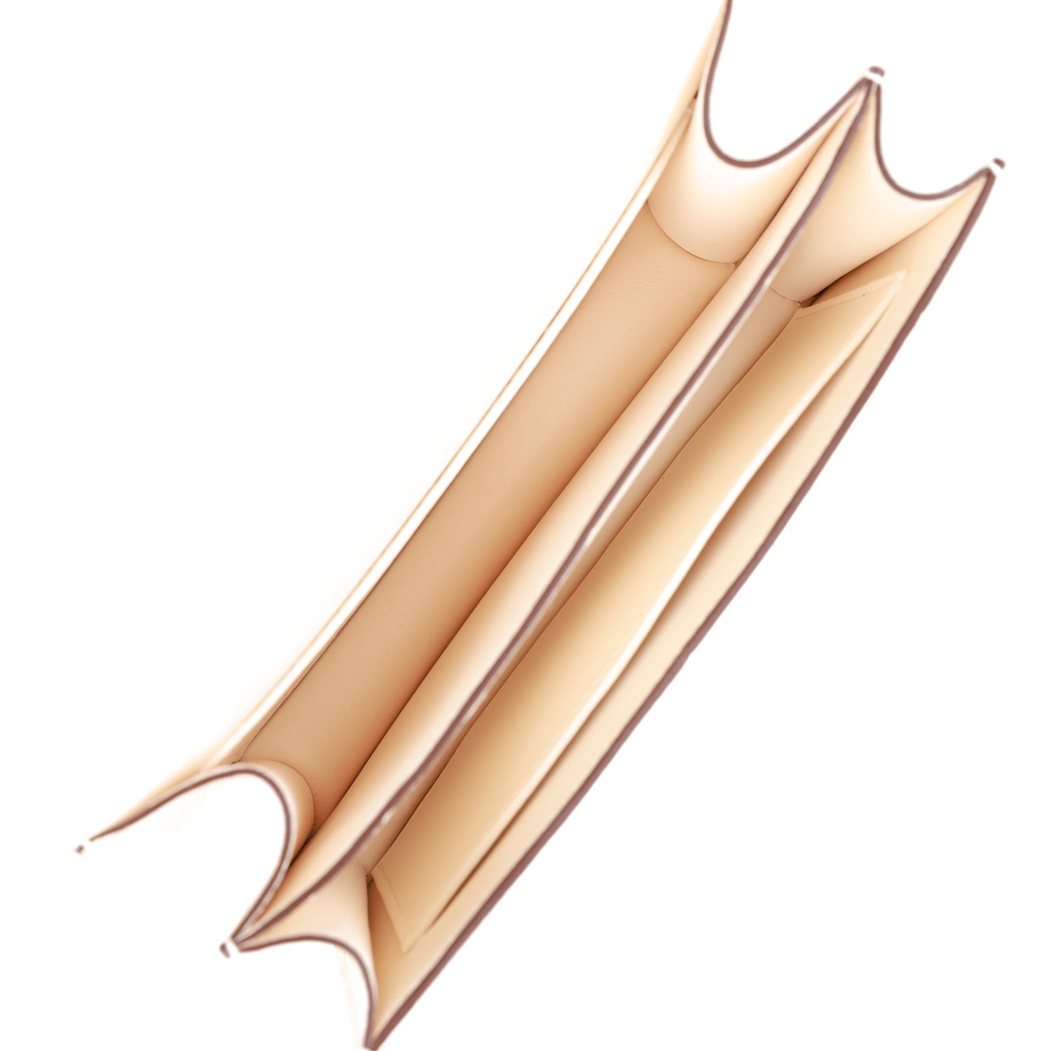 The interior is lined with Nata lambskin and has an open pocket on the front wall. a center divide. and a slit pocket on the back wall.