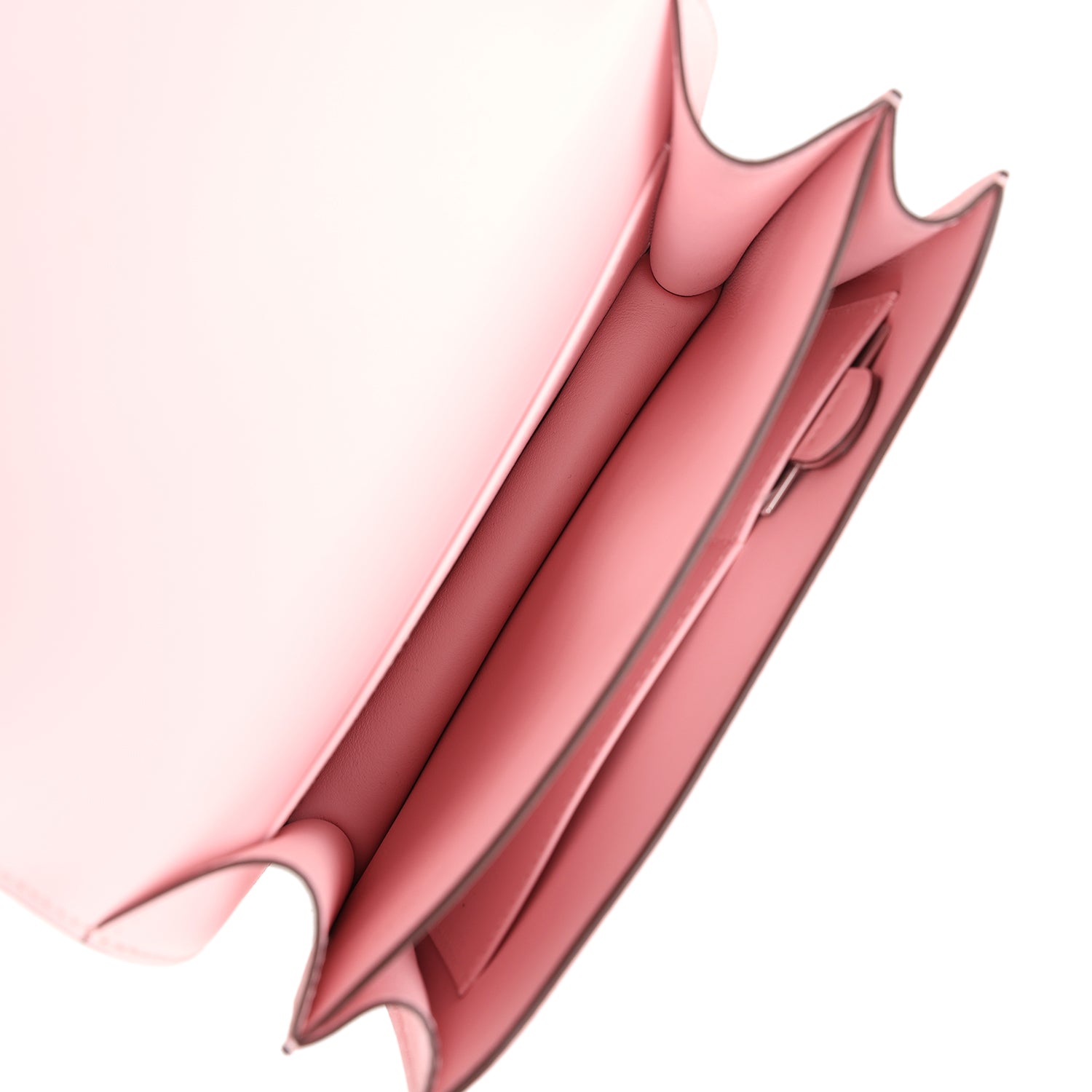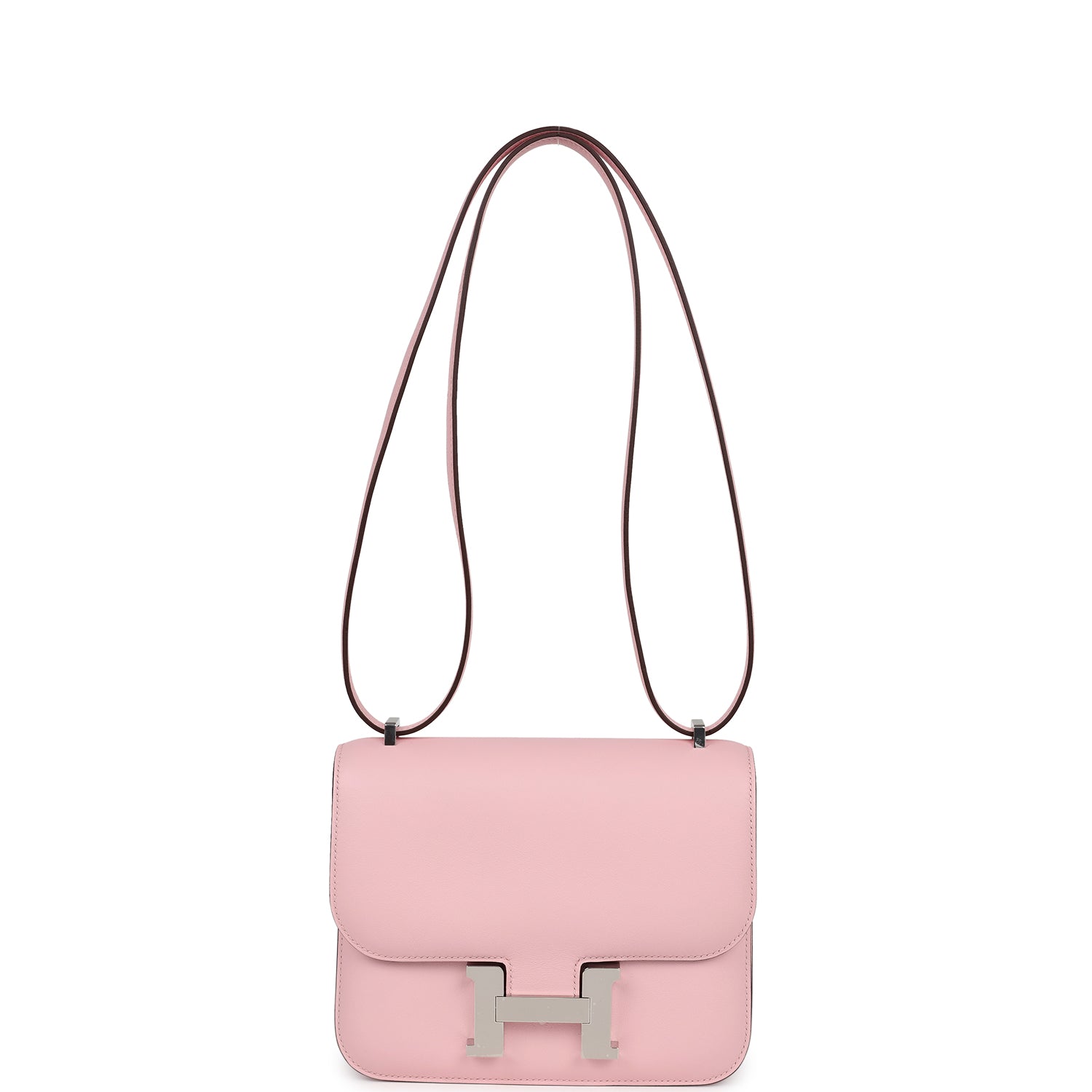 This Constance 18 is in Rose Sakura swift leather with palladium hardware. tonal stitching. a metal "H" snap lock closure and adjustable shoulder strap.