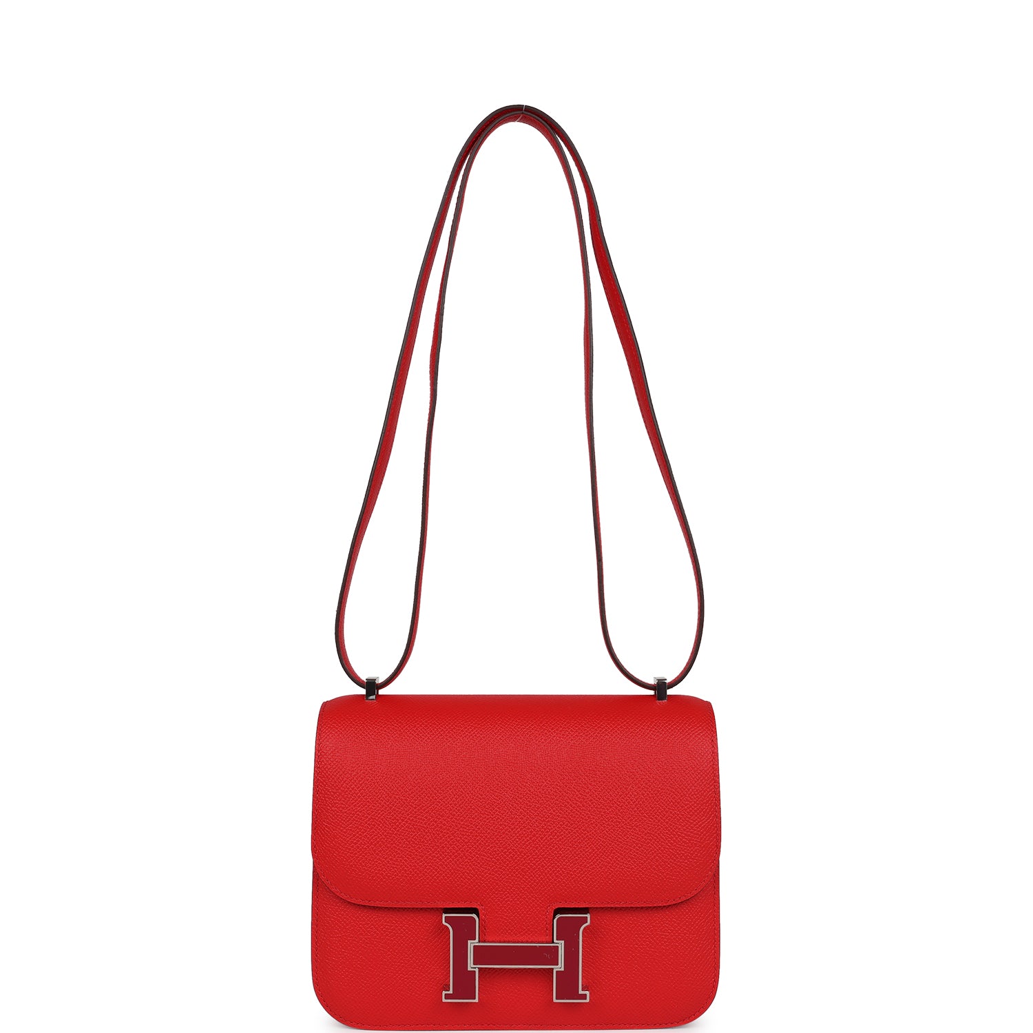 This Constance is in Rouge De Coeur epsom leather with palladium and lacquered metal hardware. has tonal stitching. a metal "H" snap lock closure and an adjustable shoulder strap.