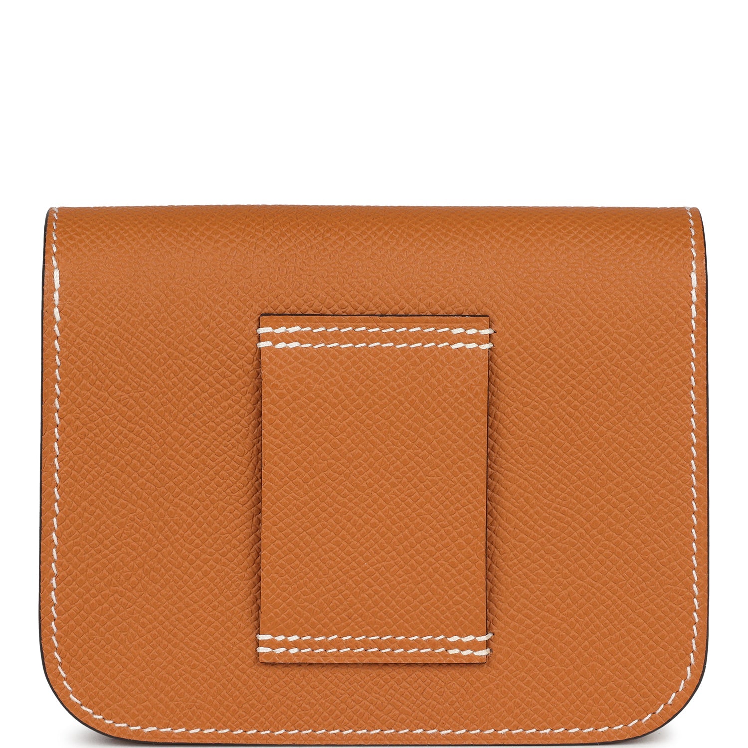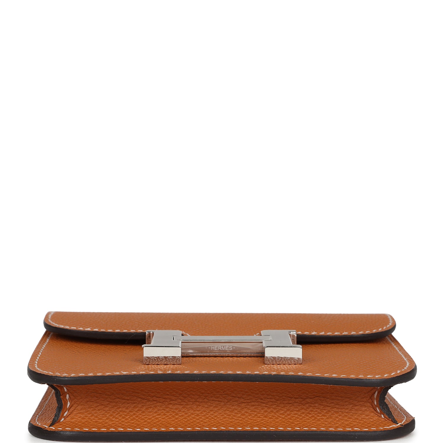 This Constance Slim Wallet is in Toffee epsom leather with palladium hardware and has contrast stitching. rear belt loop. front flap and removable coin pouch.