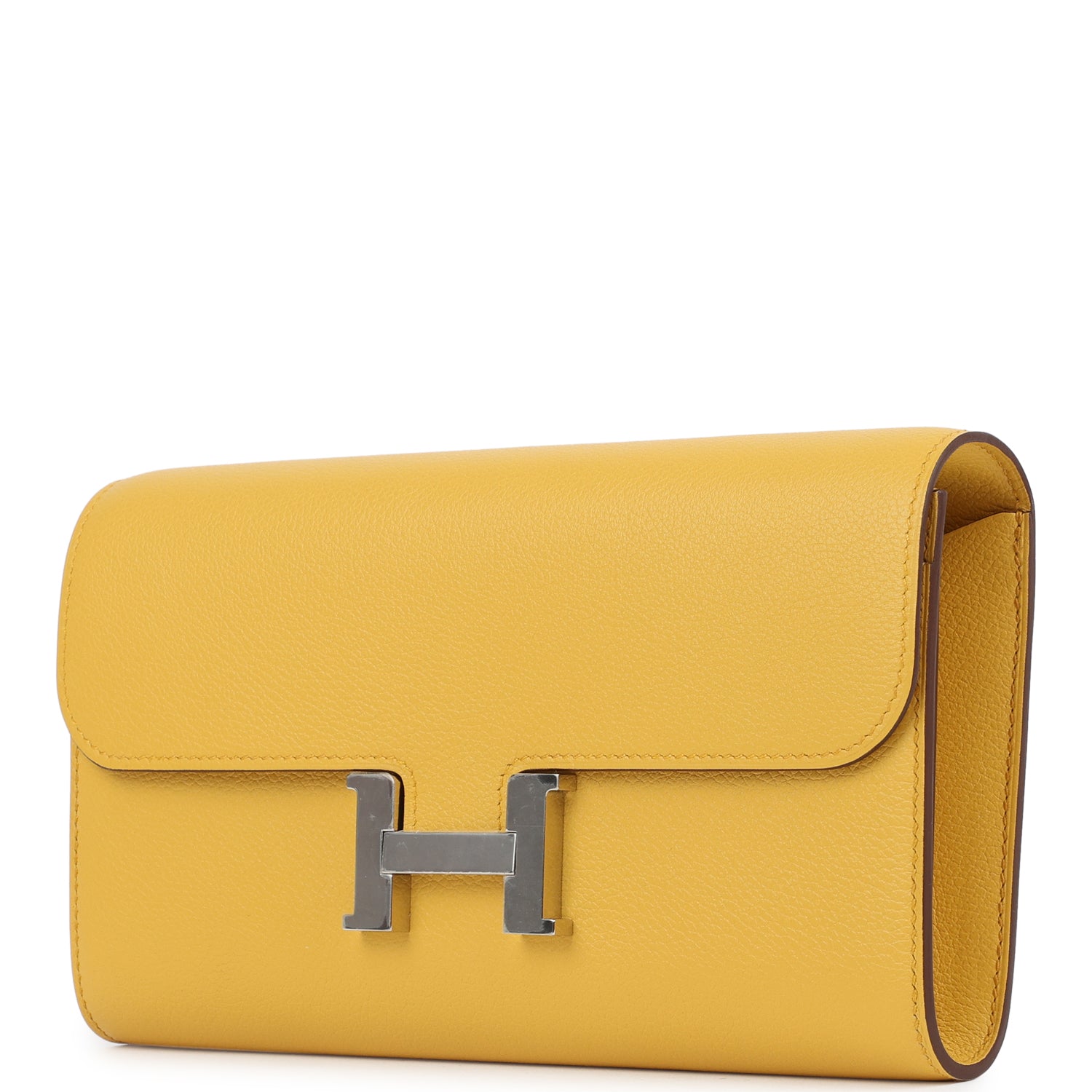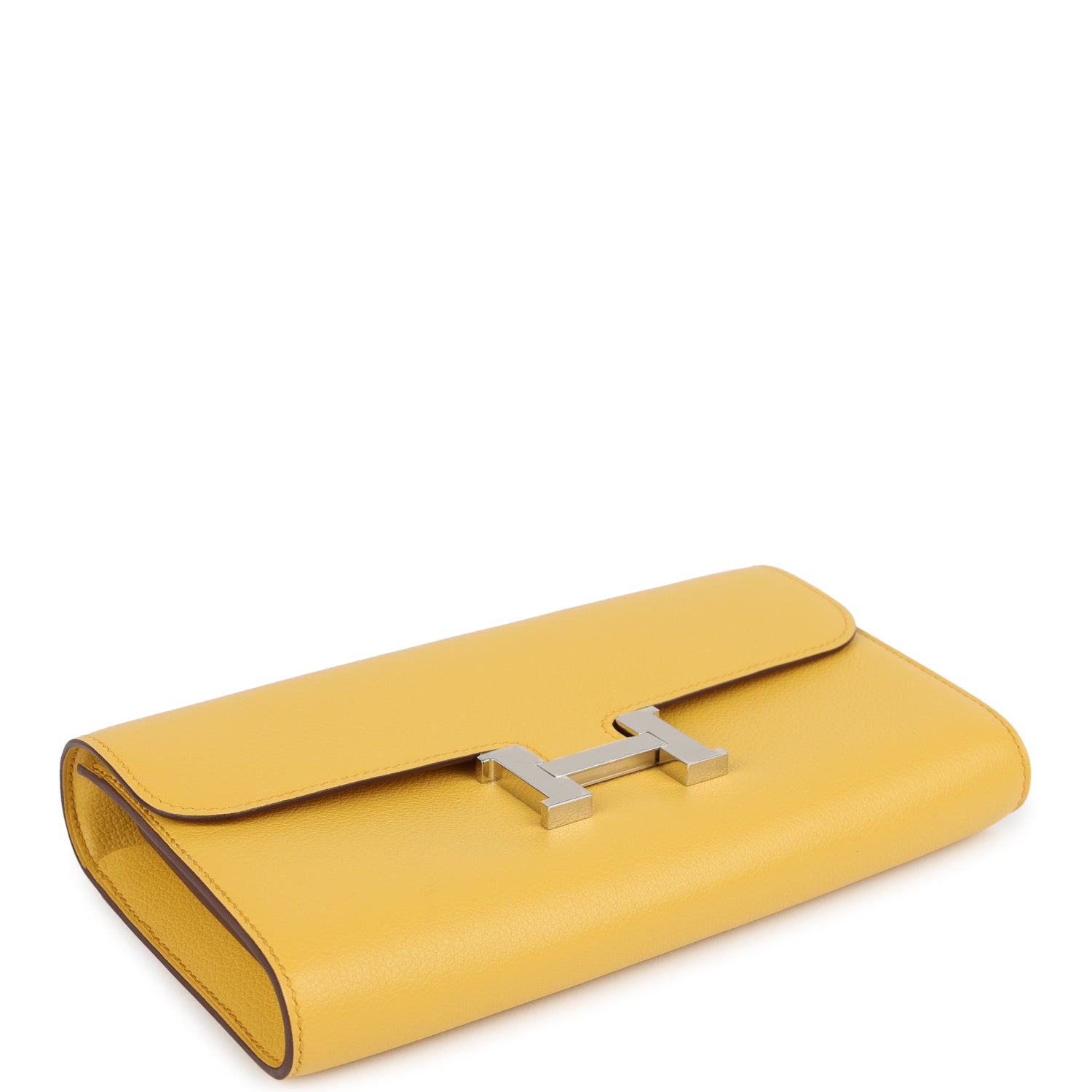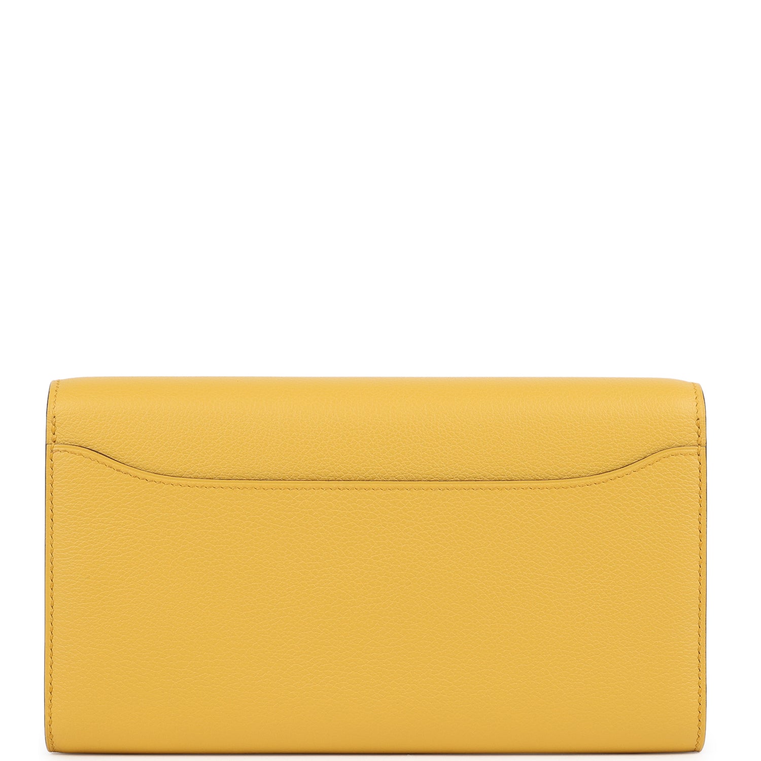 This Constance Wallet To Go is in Jaune Ambre evercolor leather with palladium hardware and has tonal stitching. metal "H" snap lock closure. open front compartment and removable crossbody strap.