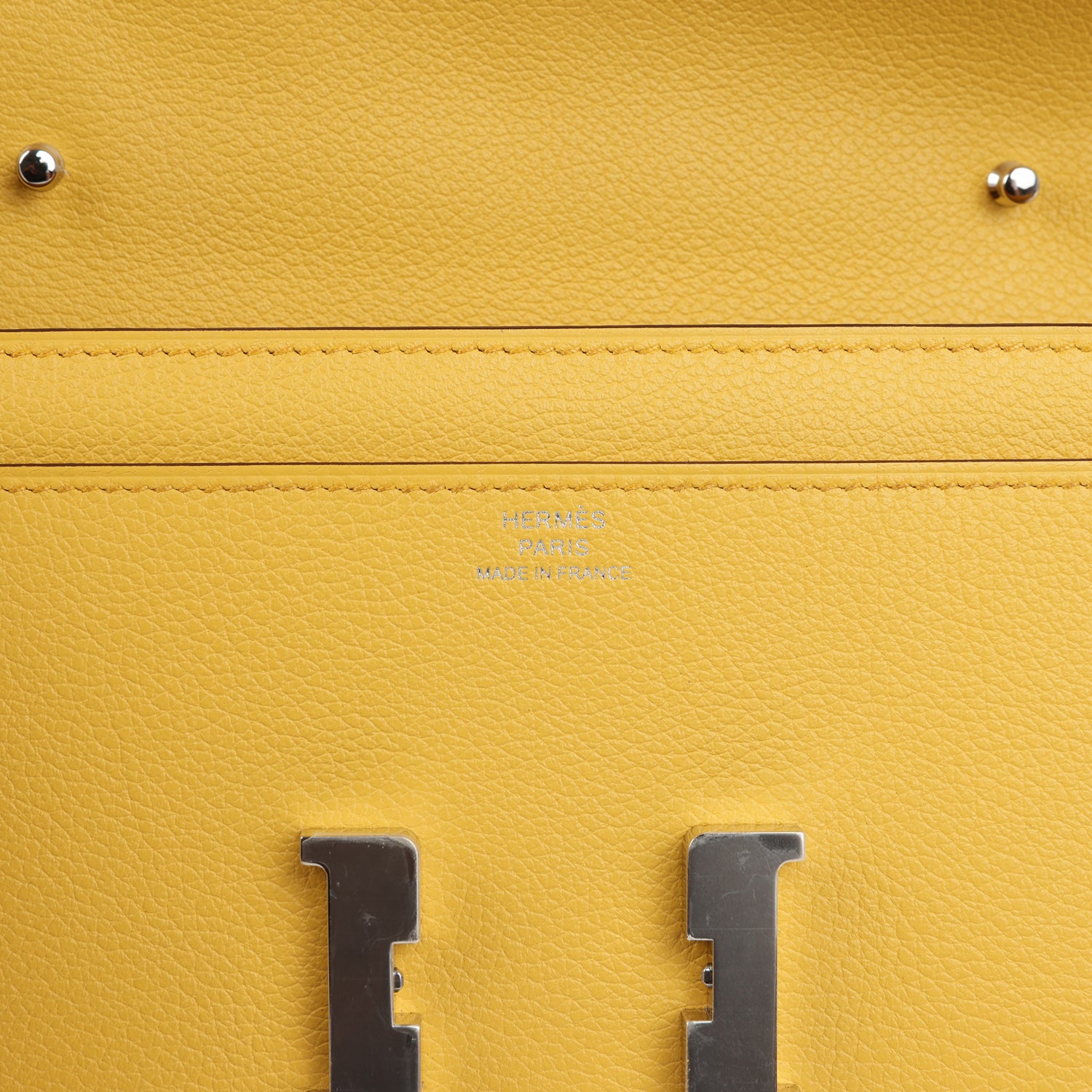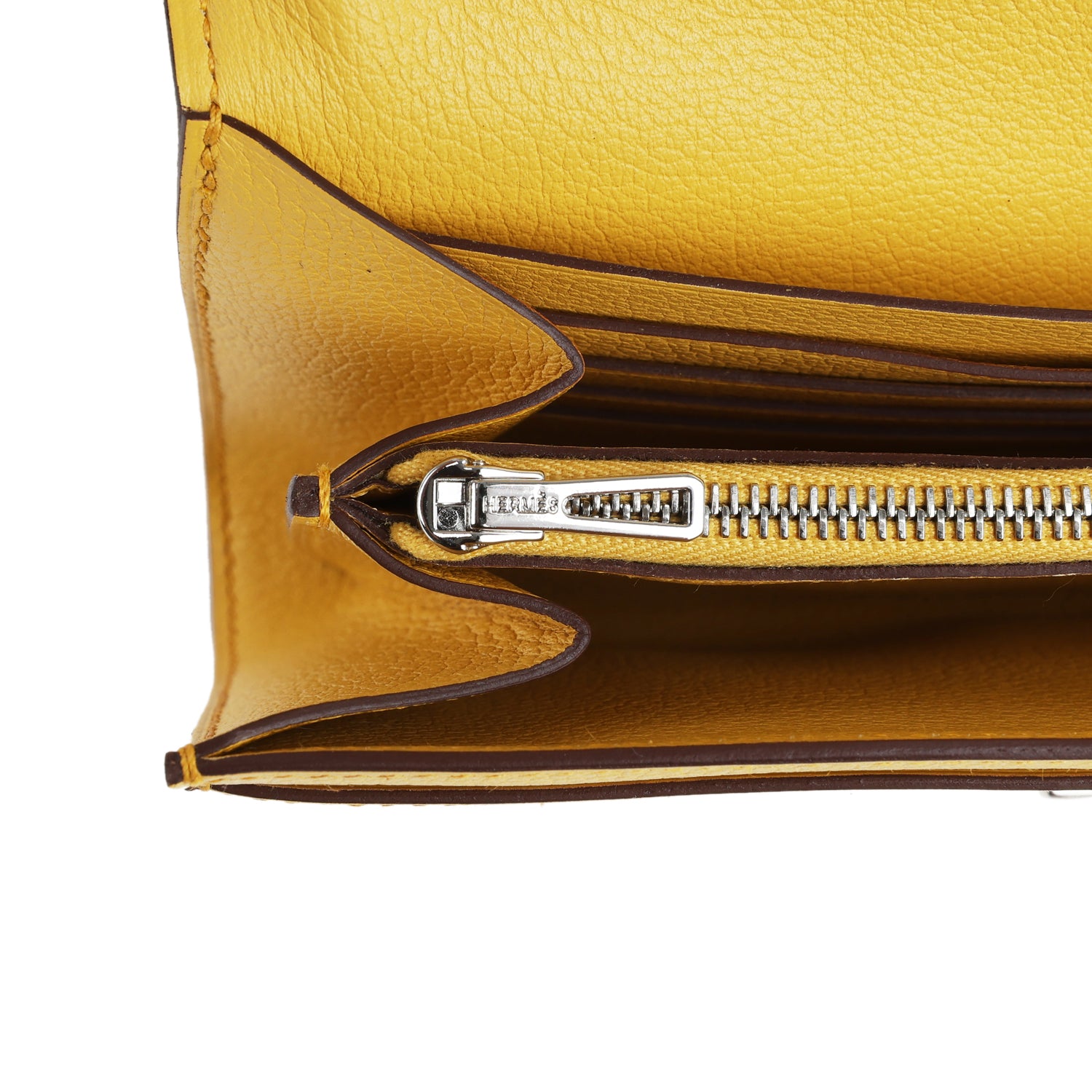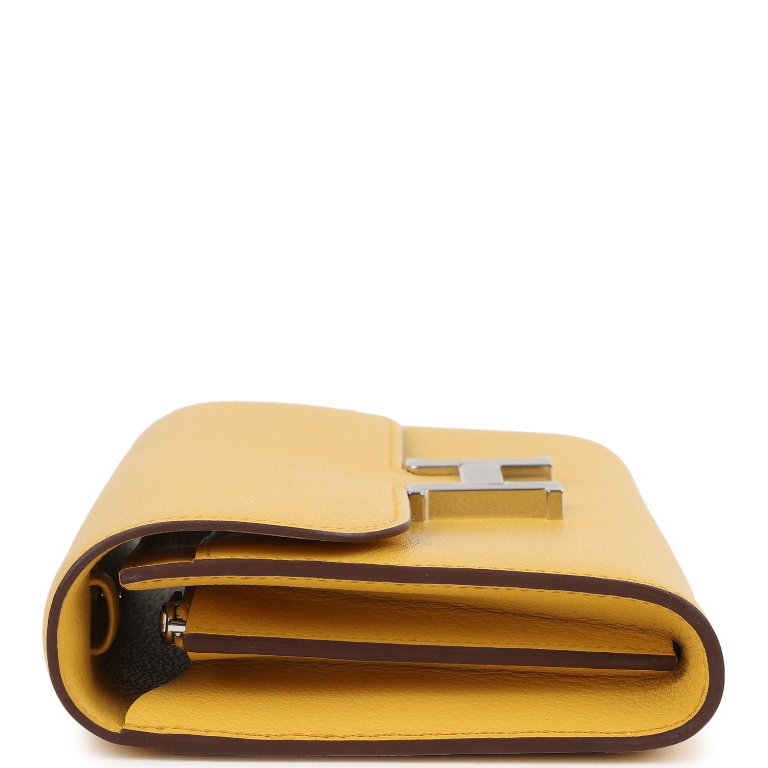 This Constance Wallet To Go is in Jaune Ambre evercolor leather with palladium hardware and has tonal stitching. metal "H" snap lock closure. open front compartment and removable crossbody strap.