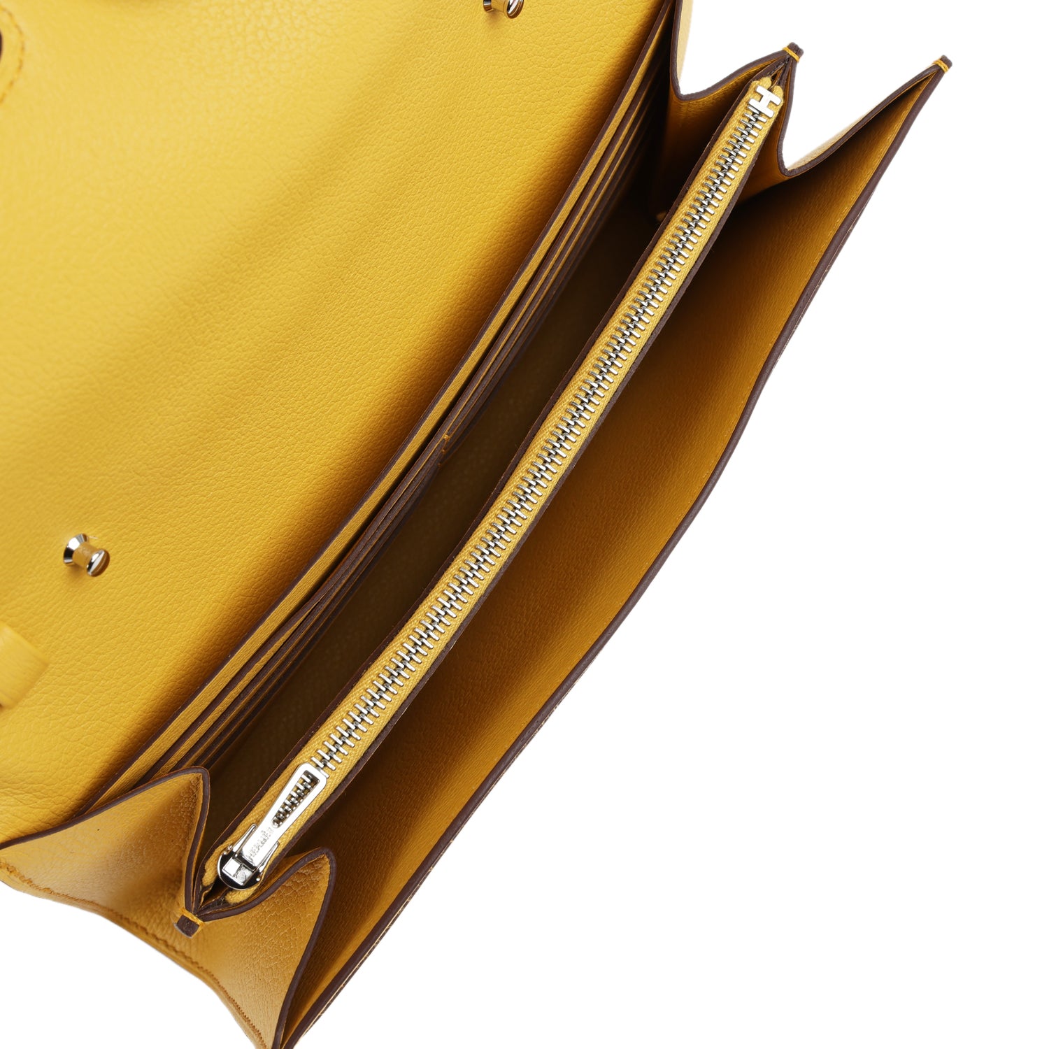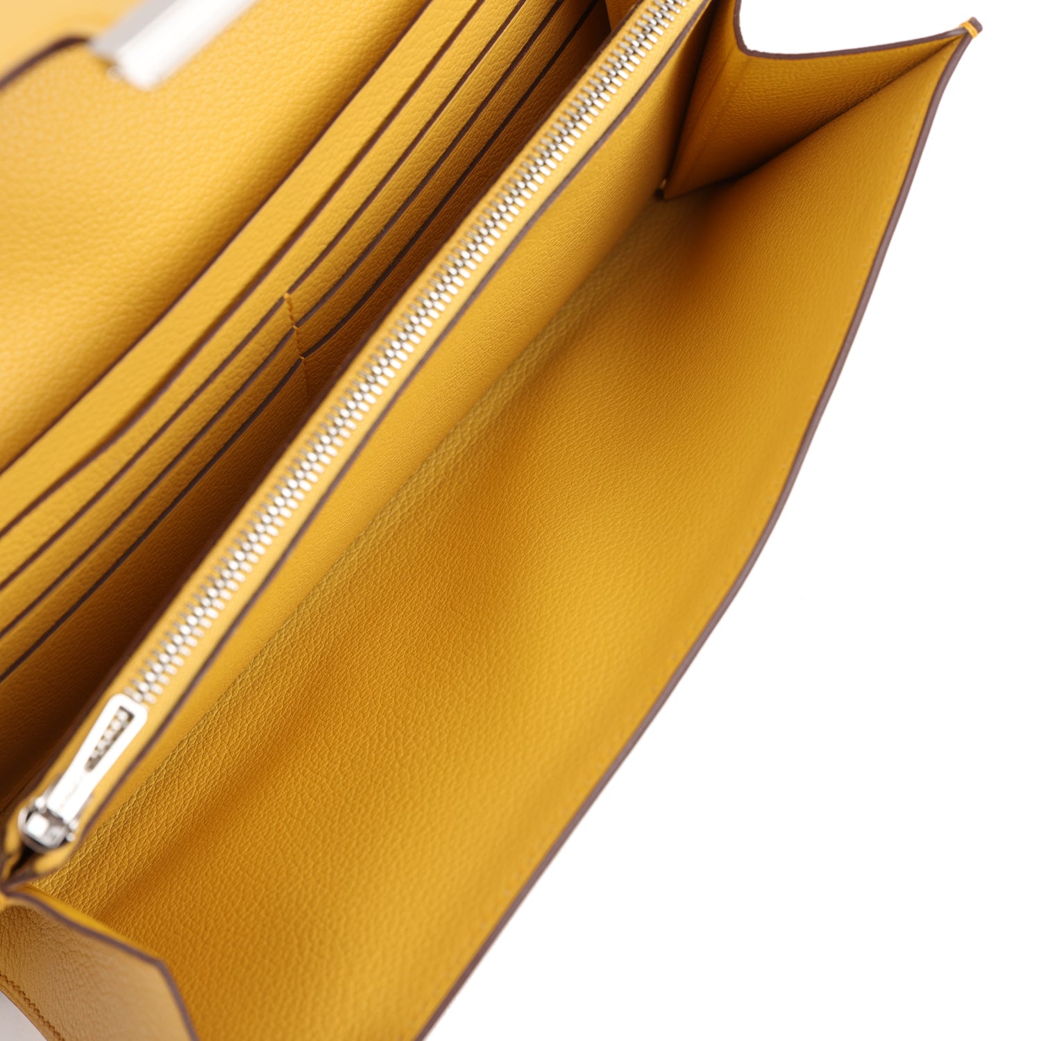 The interior is lined with Jaune Ambre evercolor leather and two main compartments with six credit card slots and a zippered center compartment with Hermes H lock pull.