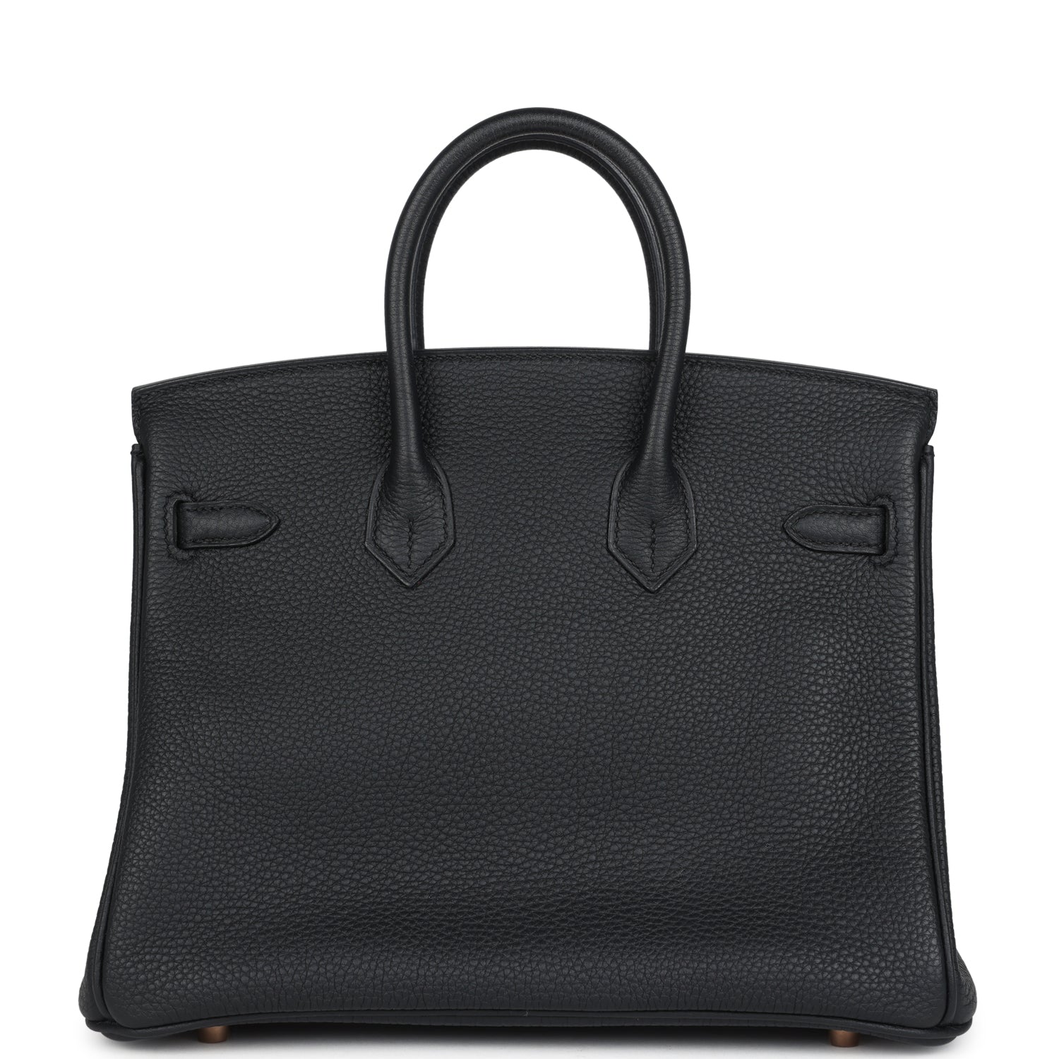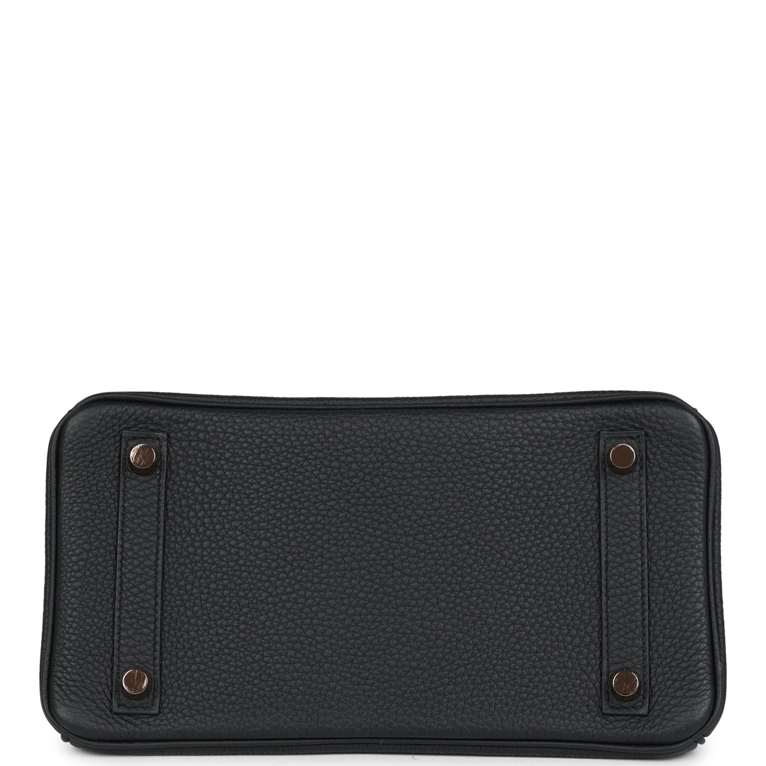 This Hermes Birkin is in Black togo leather with rose gold hardware tonal stitching. front flap with two straps. front toggle closure. clochette with lock and two keys. and double rolled handles.