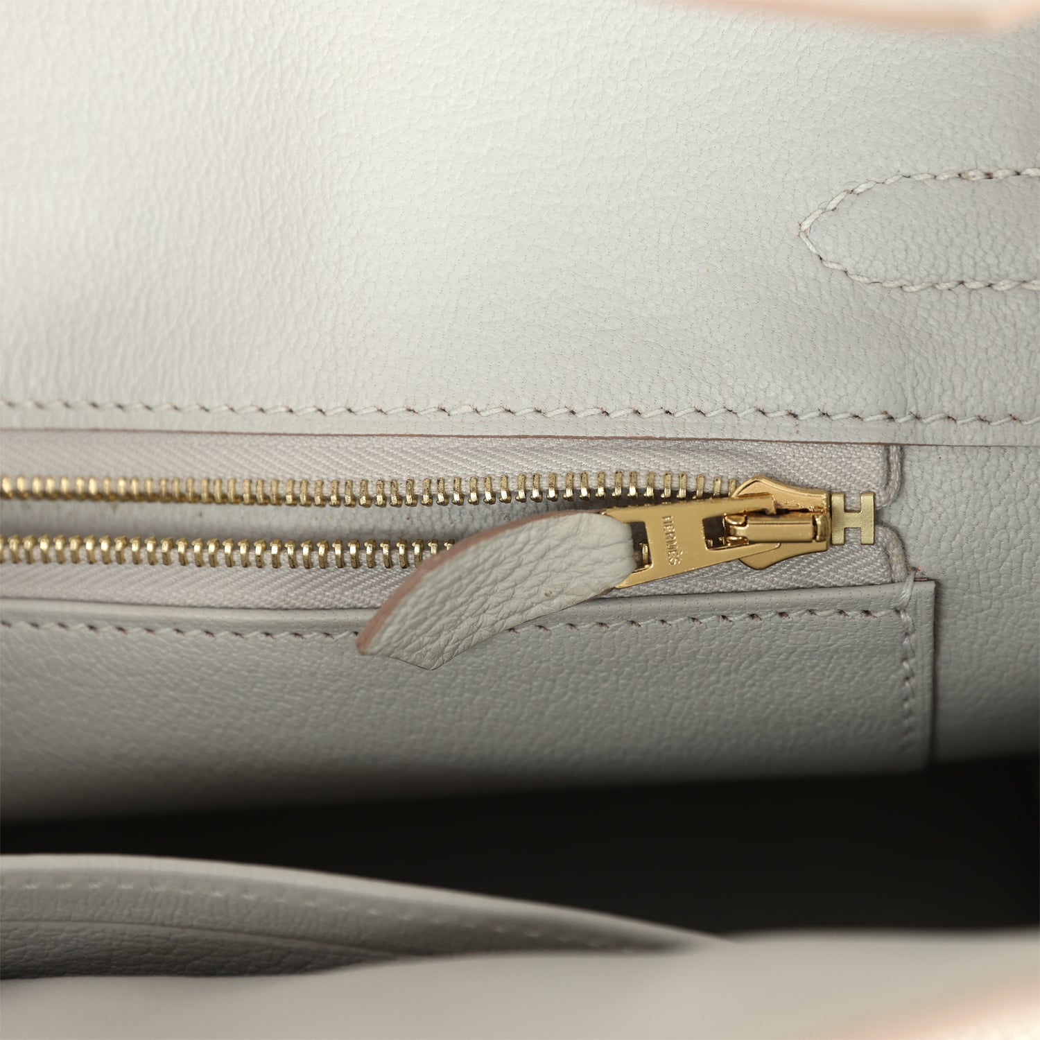 The interior is lined with Gris Perle chevre leather and has a zip pocket with an Hermes engraved zipper pull and an open pocket on the opposite side.