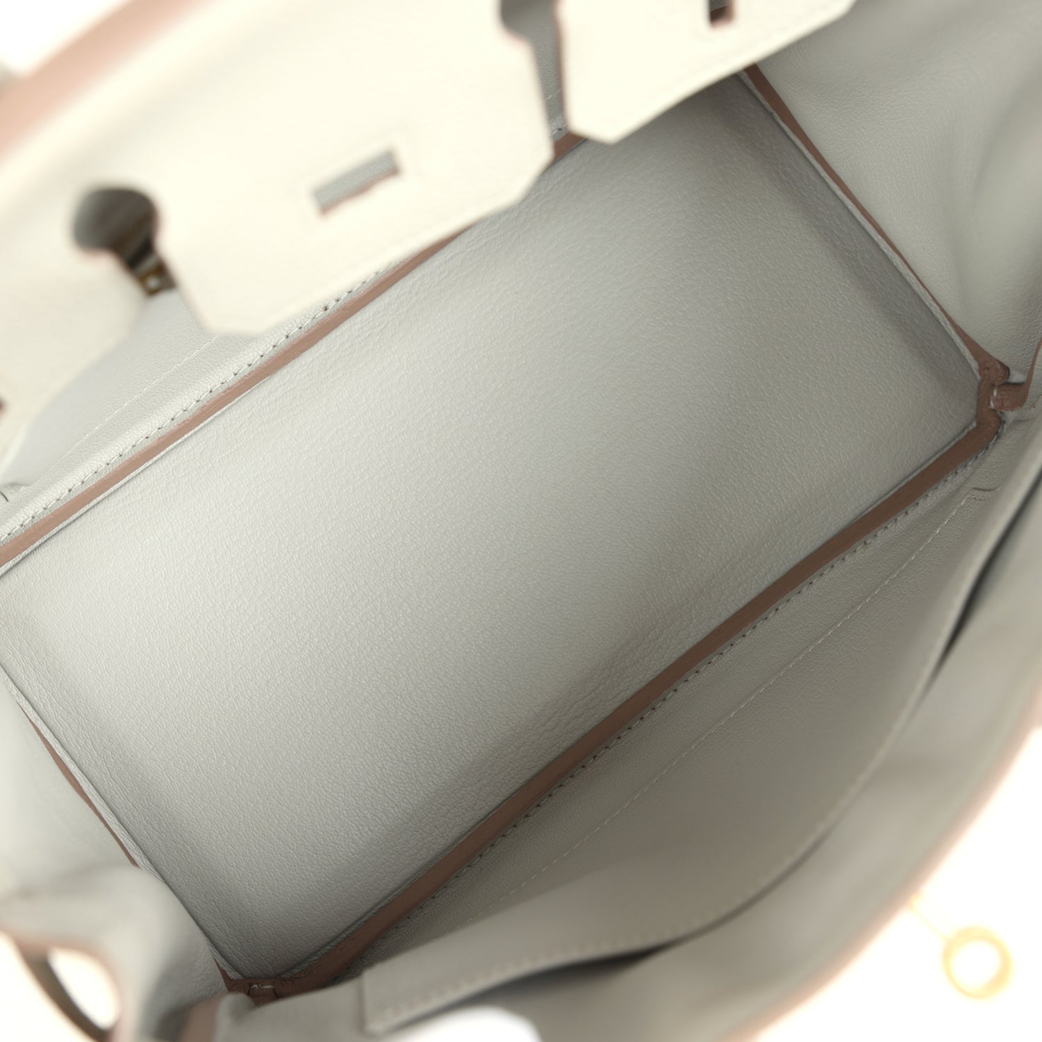 This Birkin is in Gris Perle togo leather with gold hardware. has tonal stitching. front flap. two straps with center toggle closure. clochette with lock and two keys. and double rolled handles.