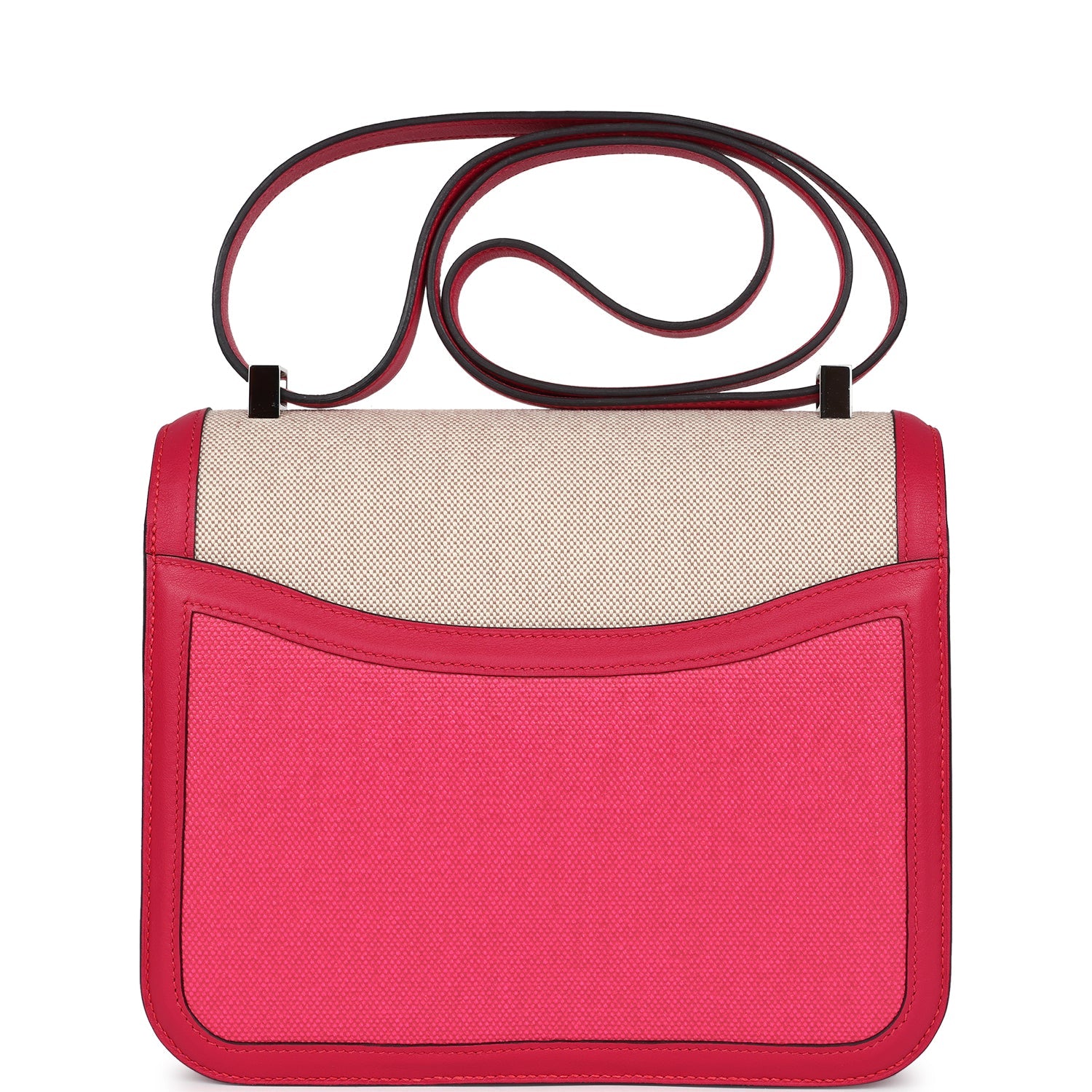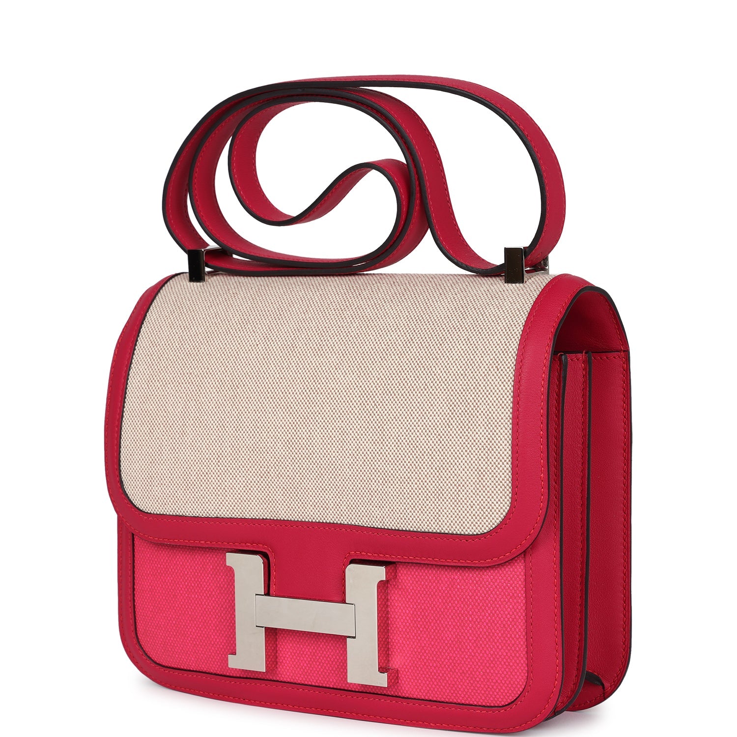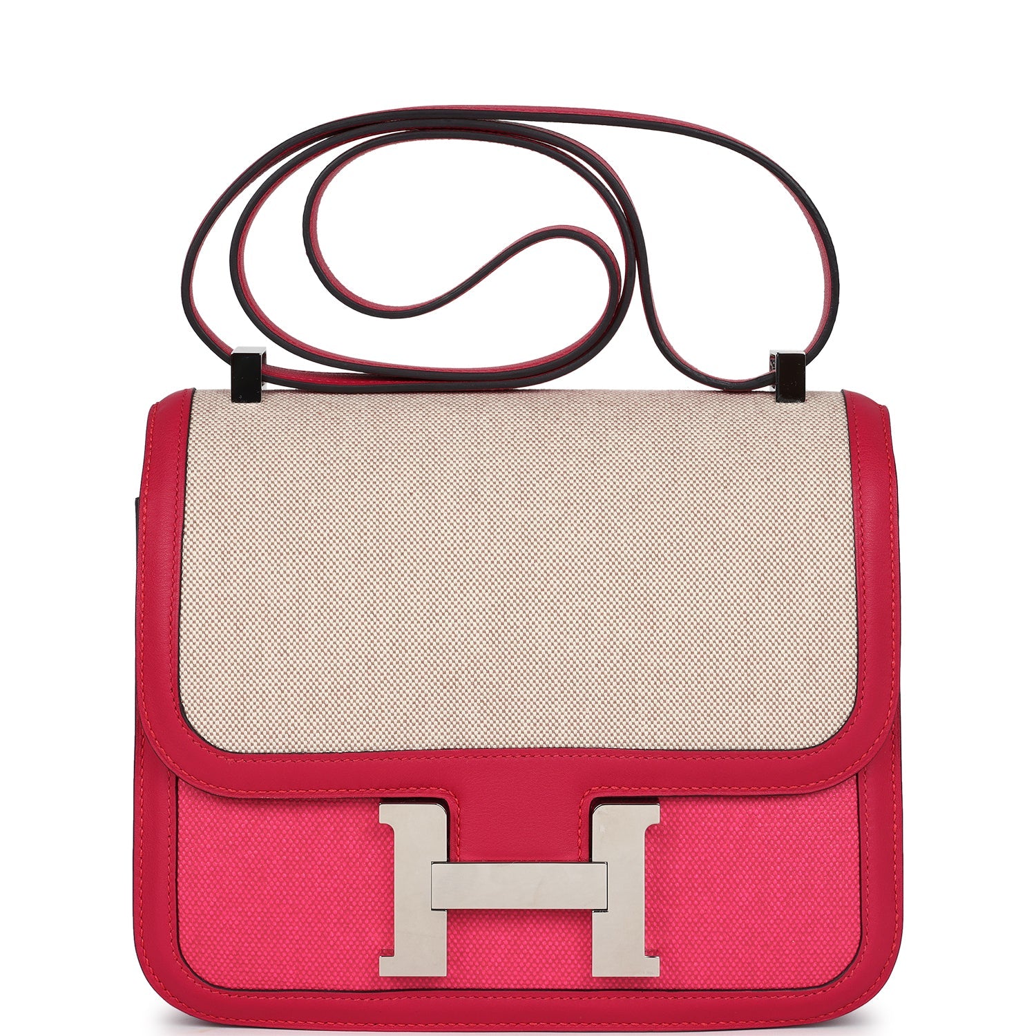 This Constance 24 is in Rose Shocking & Ecru Toile H Berline canvas and Framboise swift leather with palladium hardware and has tonal stitching. a metal "H" snap lock closure. and adjustable shoulder strap.