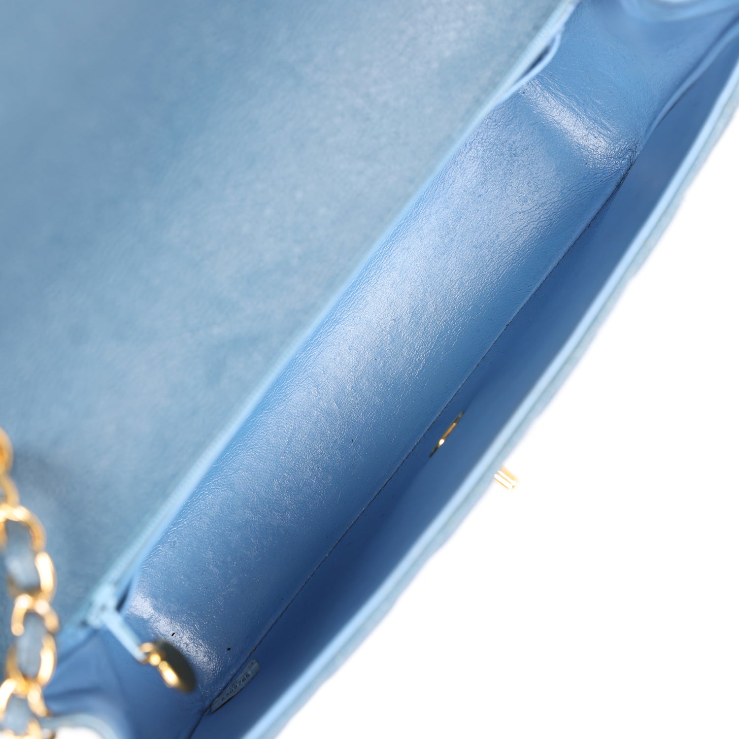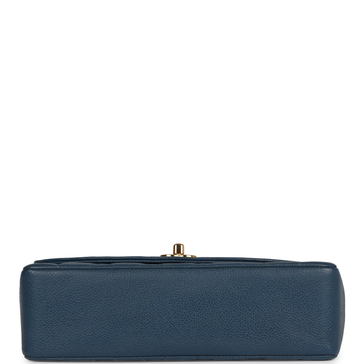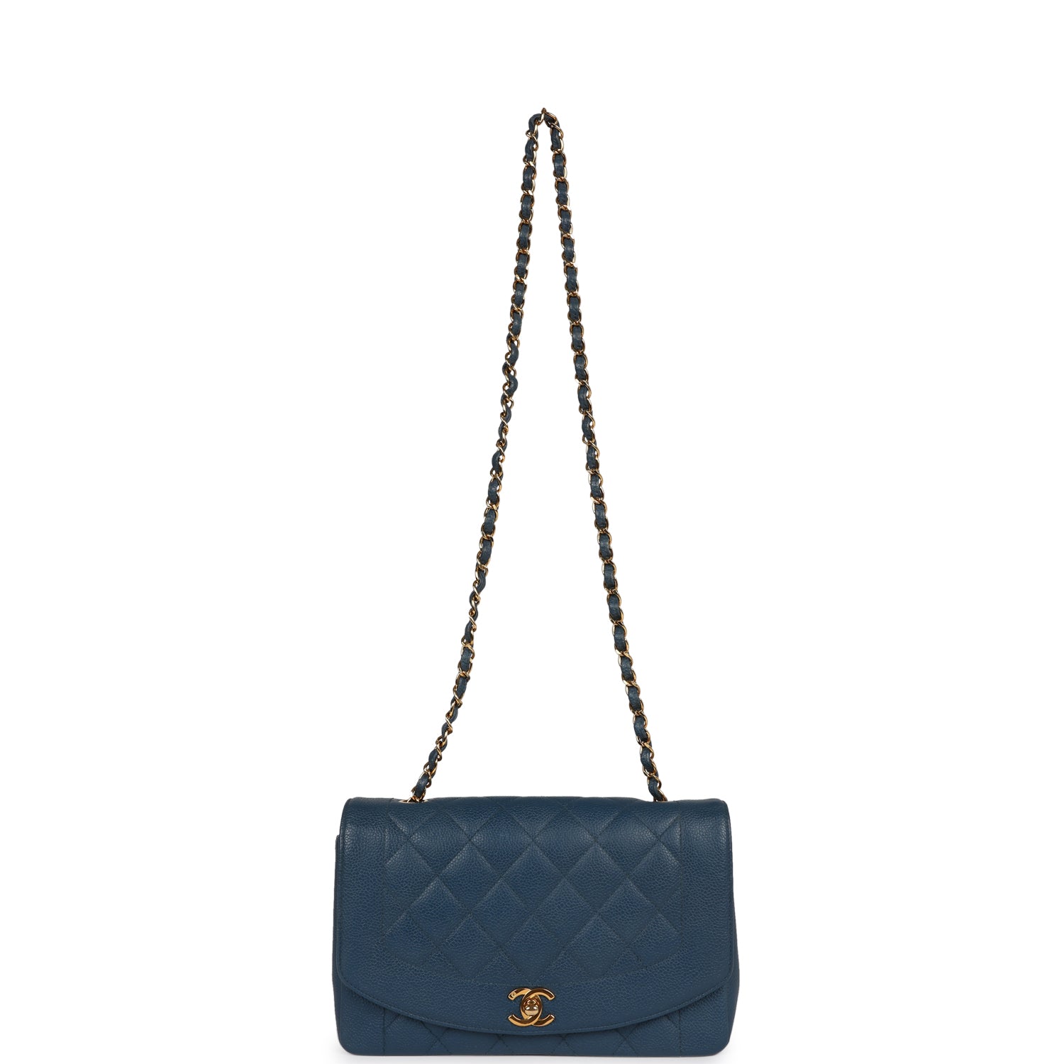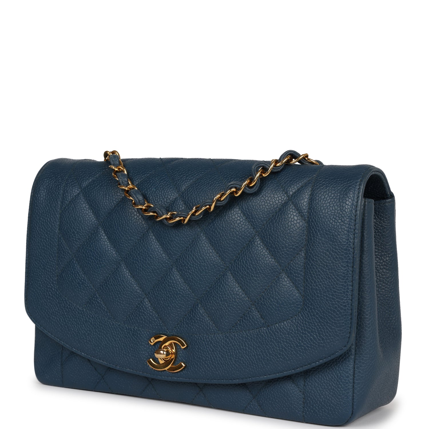 This vintage Medium Diana Flap Bag is in blue in caviar with gold plated hardware. front flap with CC turnlock closure. single insert back pocket and adjustable interwoven gold plated chain link and Blue caviar leather shoulder/crossbody strap