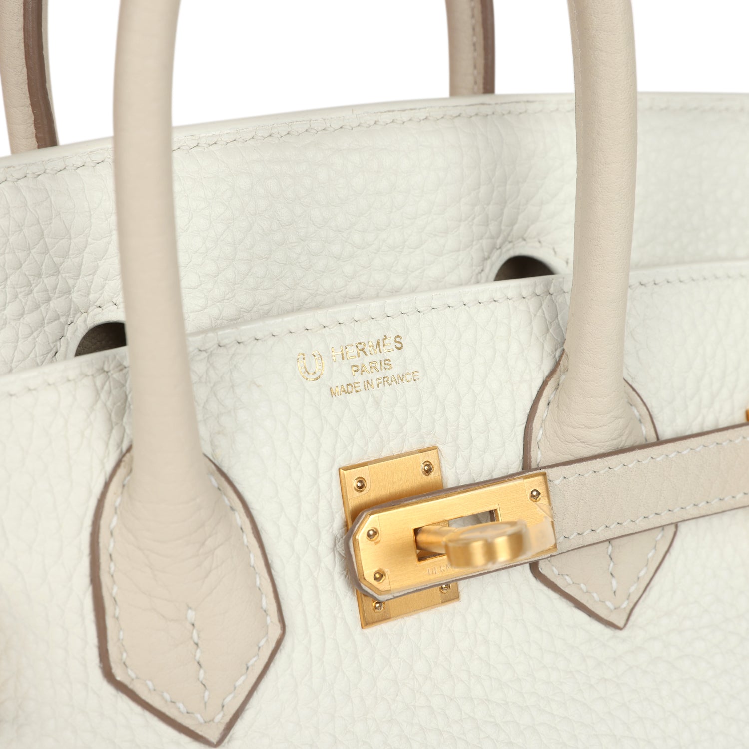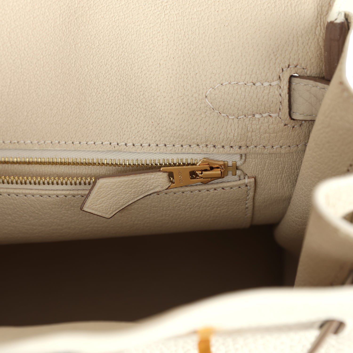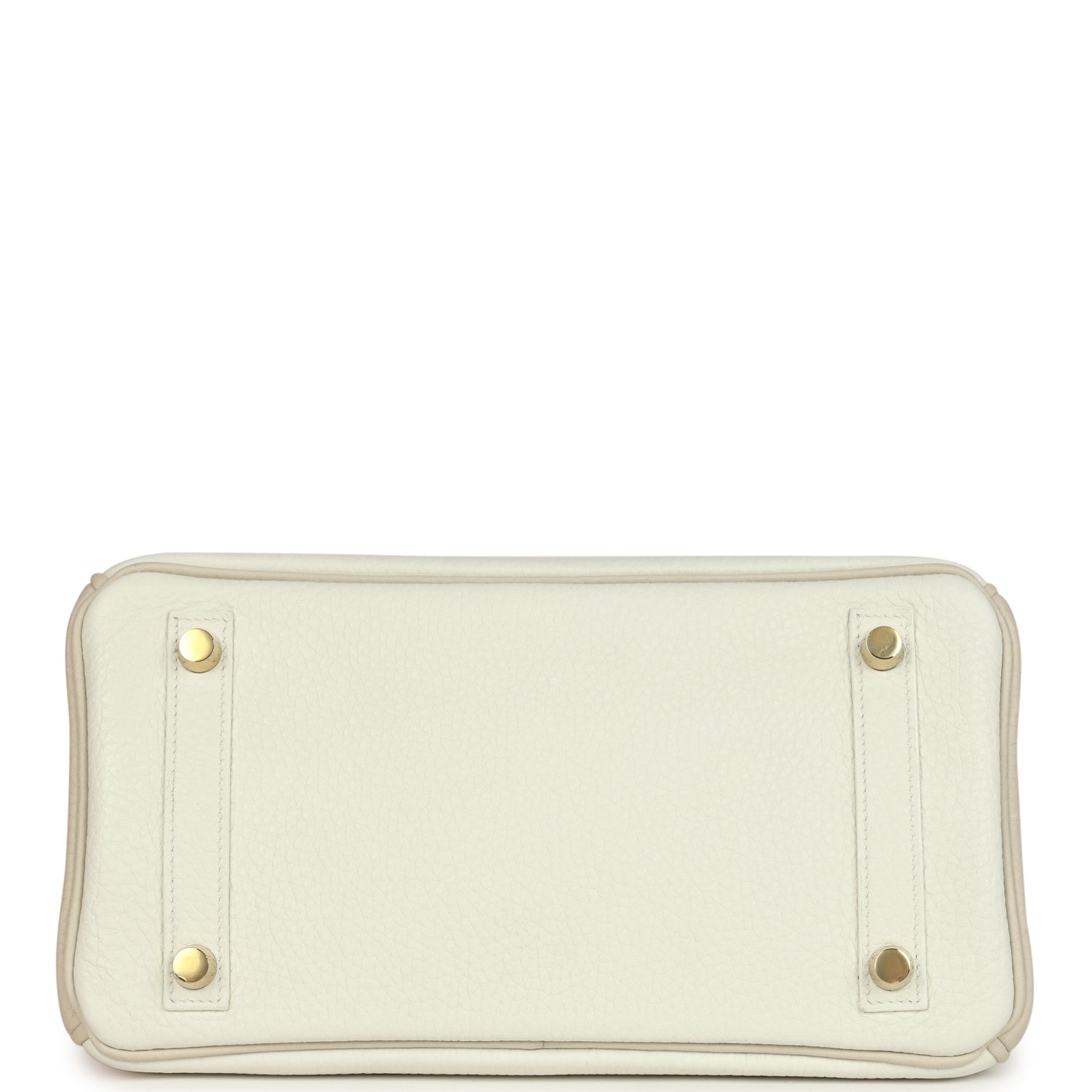 This Special Order Bi-color Birkin is in White and Trench togo leather with brushed gold hardware. has a mixture of contrast and tonal stitching. front flap. two straps with center toggle closure. clochette with lock and two keys. and double rolled handles.