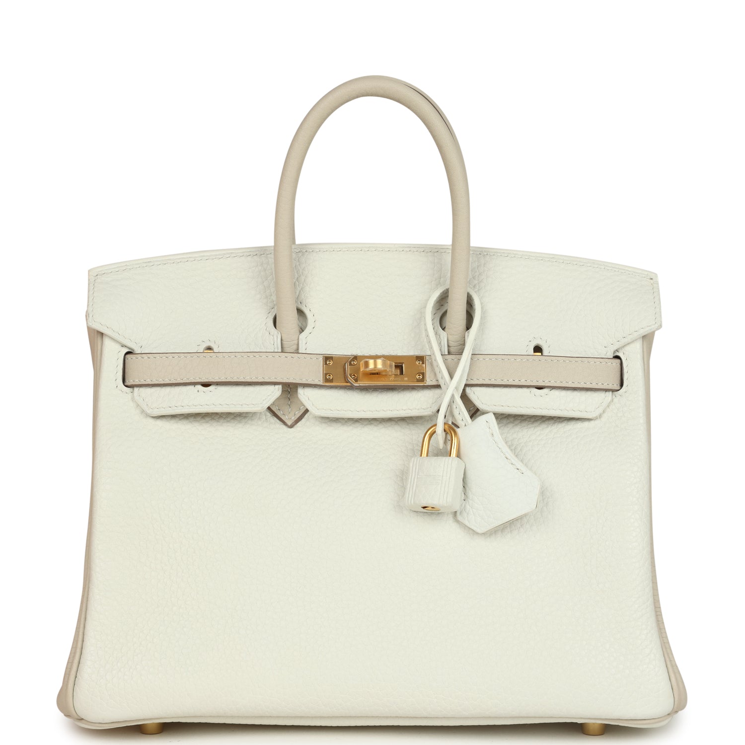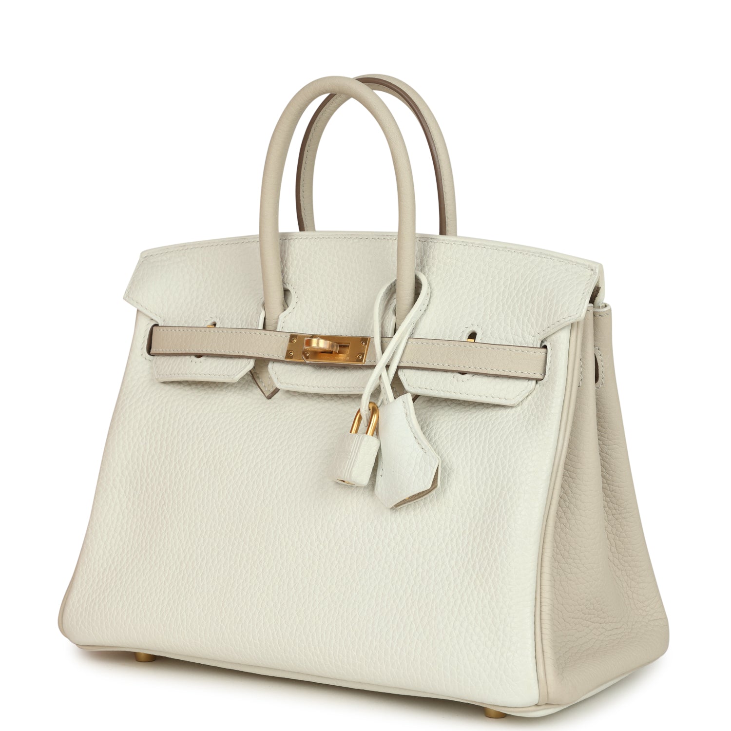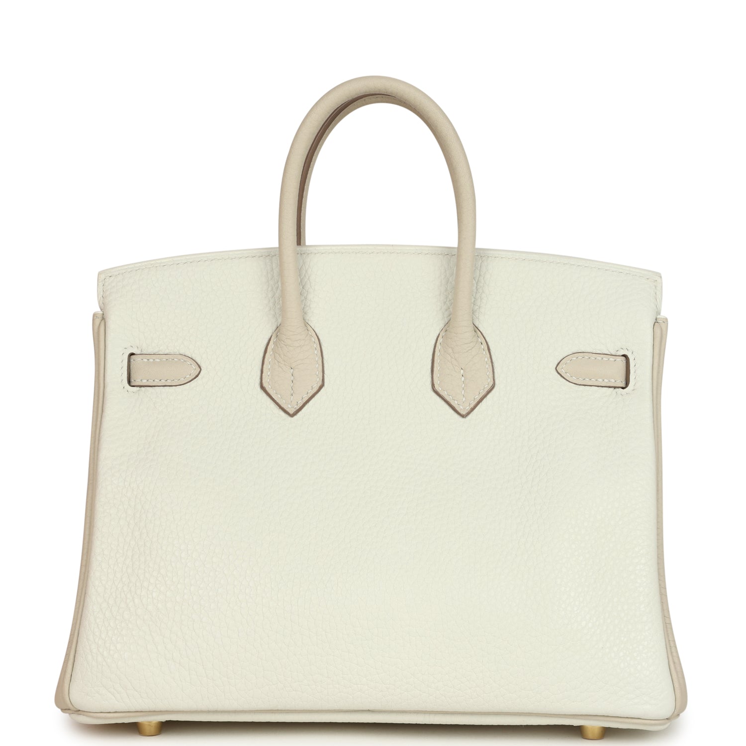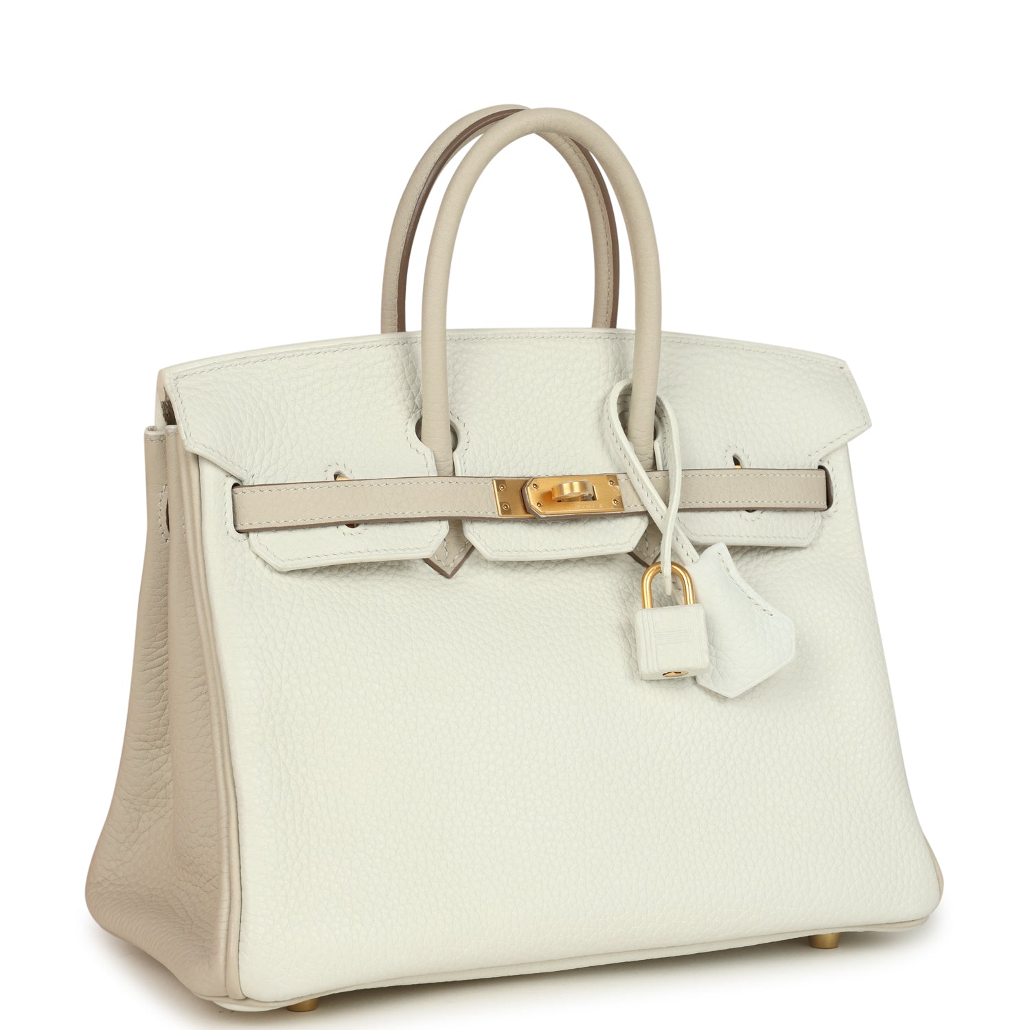 This Special Order Bi-color Birkin is in White and Trench togo leather with brushed gold hardware. has a mixture of contrast and tonal stitching. front flap. two straps with center toggle closure. clochette with lock and two keys. and double rolled handles.