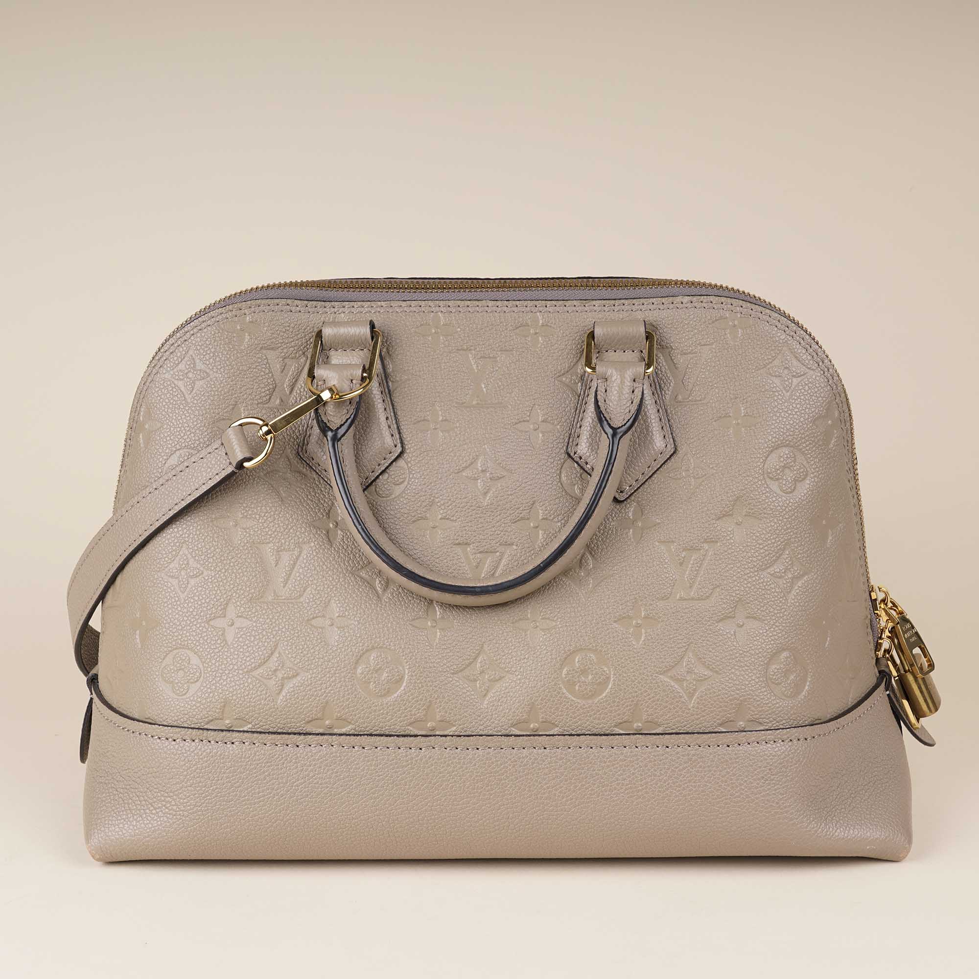 Upgrade your wardrobe with the stunning and feminine Neo Alma PM Top Handle. Made from Dune-colored Monogram Empreinte and grained cowhide leather. this bag features versatile handles and a removable (non adjustable) shoulder strap. perfect for transitioning from day to evening. With classic Louis Vuitton details and a contrasting interior lining. it's both timeless and modern. Don't miss out!