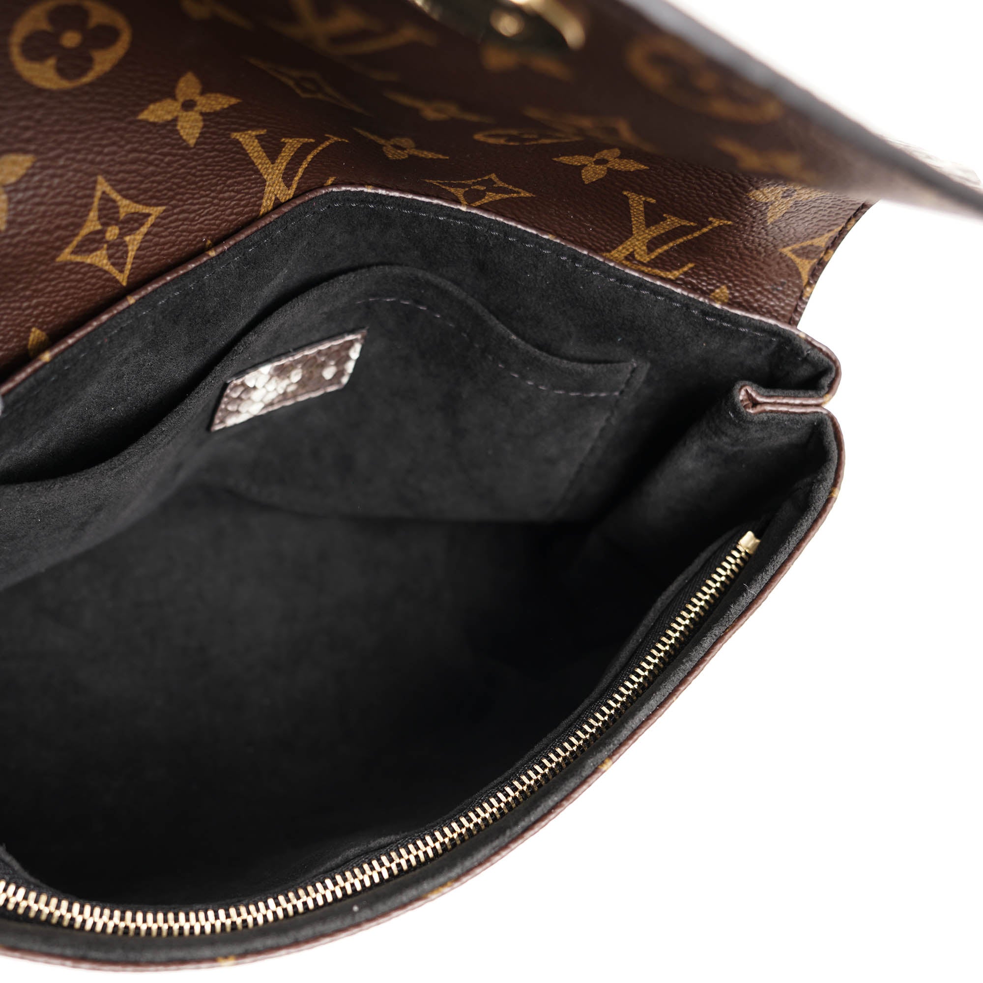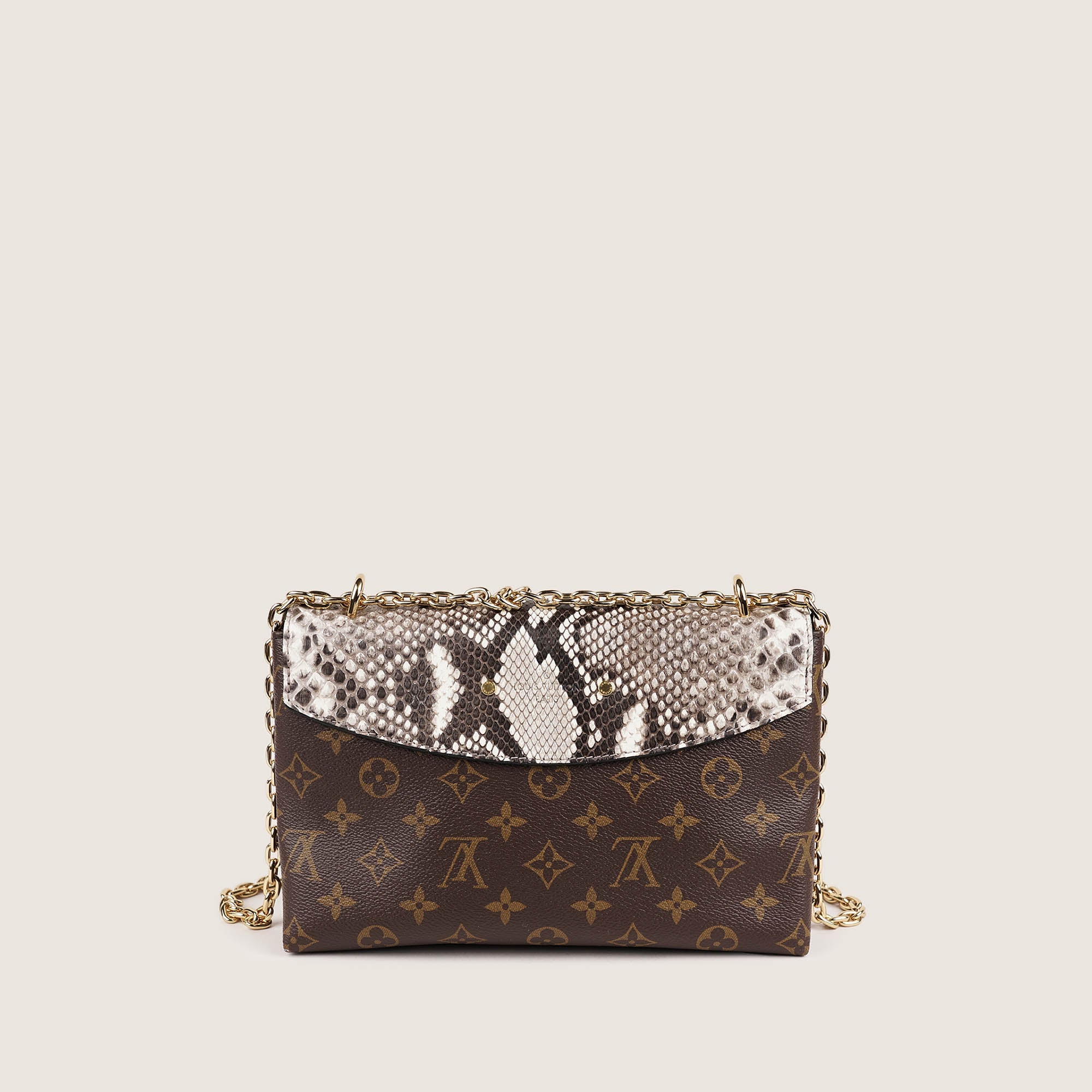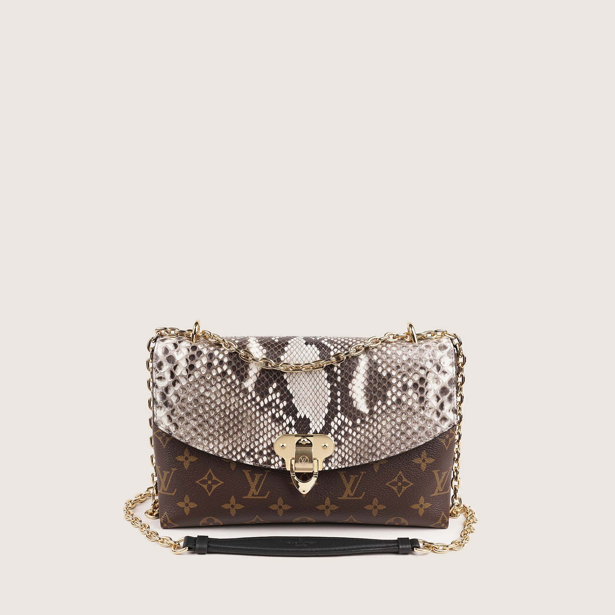The Louis Vuitton Saint Placide Shoulder Bag is a sophisticated design that blends the Maison's iconic Monogram canvas with luxurious exotic leather. Crafted with genuine python skin and finished with gold-tone hardware. this elegant bag features the signature LV clasp and a refined flap silhouette.