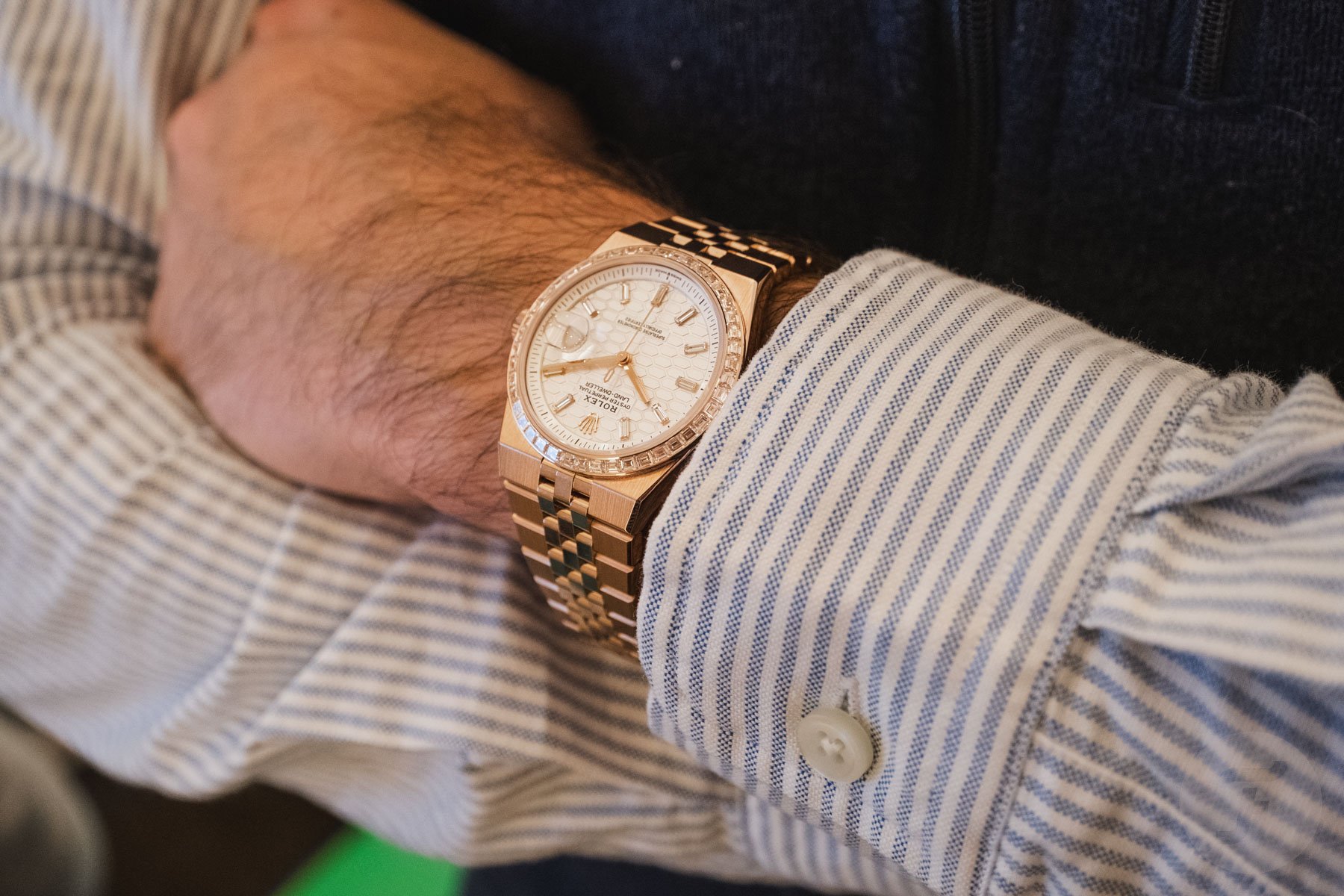 The standout feature is the intense white dial with a distinctive honeycomb motif. This intricate texture catches the light beautifully. offering subtle depth and visual interest without compromising legibility. Combined with the warm glow of Everose gold hour markers and hands. the dial achieves a harmonious blend of artistry and clarity.