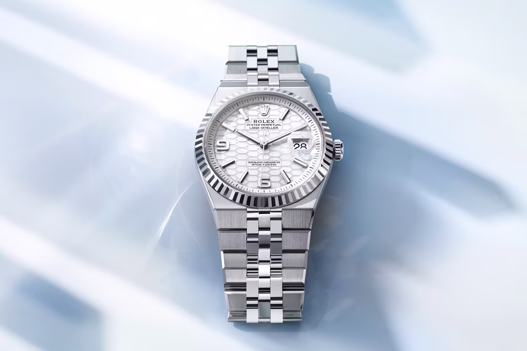 Mounted on the flat Jubilee bracelet. the watch offers a comfortable. secure fit that drapes elegantly around the wrist. Designed for flexibility and long-term comfort. the bracelet complements the overall aesthetic with its smooth. flowing links and subtle sheen.